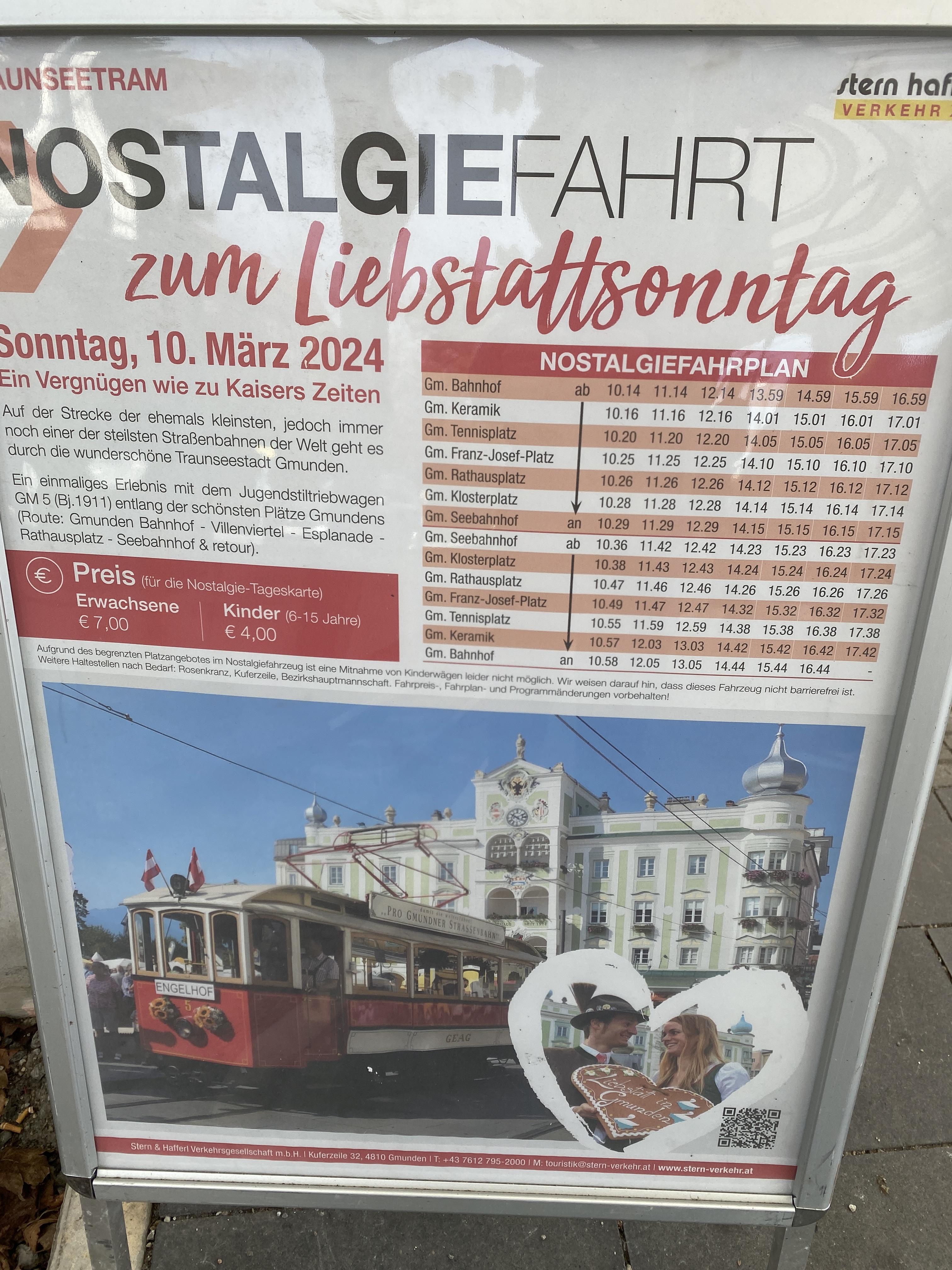 할슈타트 역에서 기차를 타고 그문덴 역에서 내렸는데 내리고 보니 여기 기차역은 마을의 중심가와 조금 떨어져 있는 곳이었다. 그래도 마을로 들어가는 전차가 있어서 티켓을 사려고 보니 티켓을 파는 곳이 없었다. 표지판들을 번역기 돌려가면서 (사실 독일어를 오래 배웠는데 번역기를 돌려야 하는게 수치스럽긴 하다) 파악을 해보니 전차 안에서 티켓을 살 수 있는 것 같았다. 그리고 다음 전차를 타고 마을로 향했다. 티켓도 왕복 티켓을 전차 안에 있는 매표기에서 쉽게 살 수 있었다. (그런데 빈에서도 그랬지만 도시 안에서 노면전차나 지하철에서 한번도 표를 검사하는 걸 본 적이 없다.) 마을의 주요 관광지를 도는 전차표를 구입하라는 광고를 봤지만 그럴만한 시간은 없어서 패스.