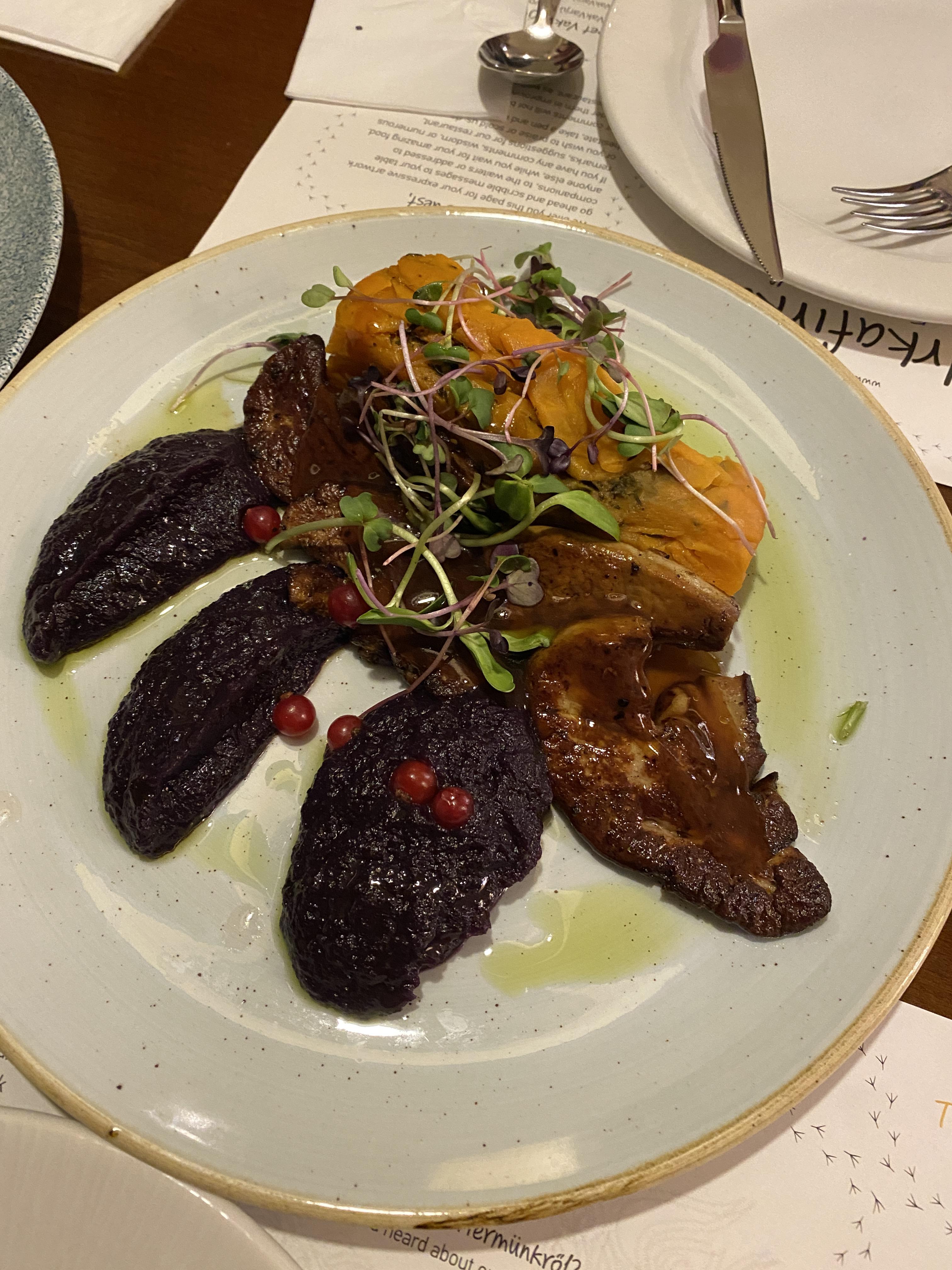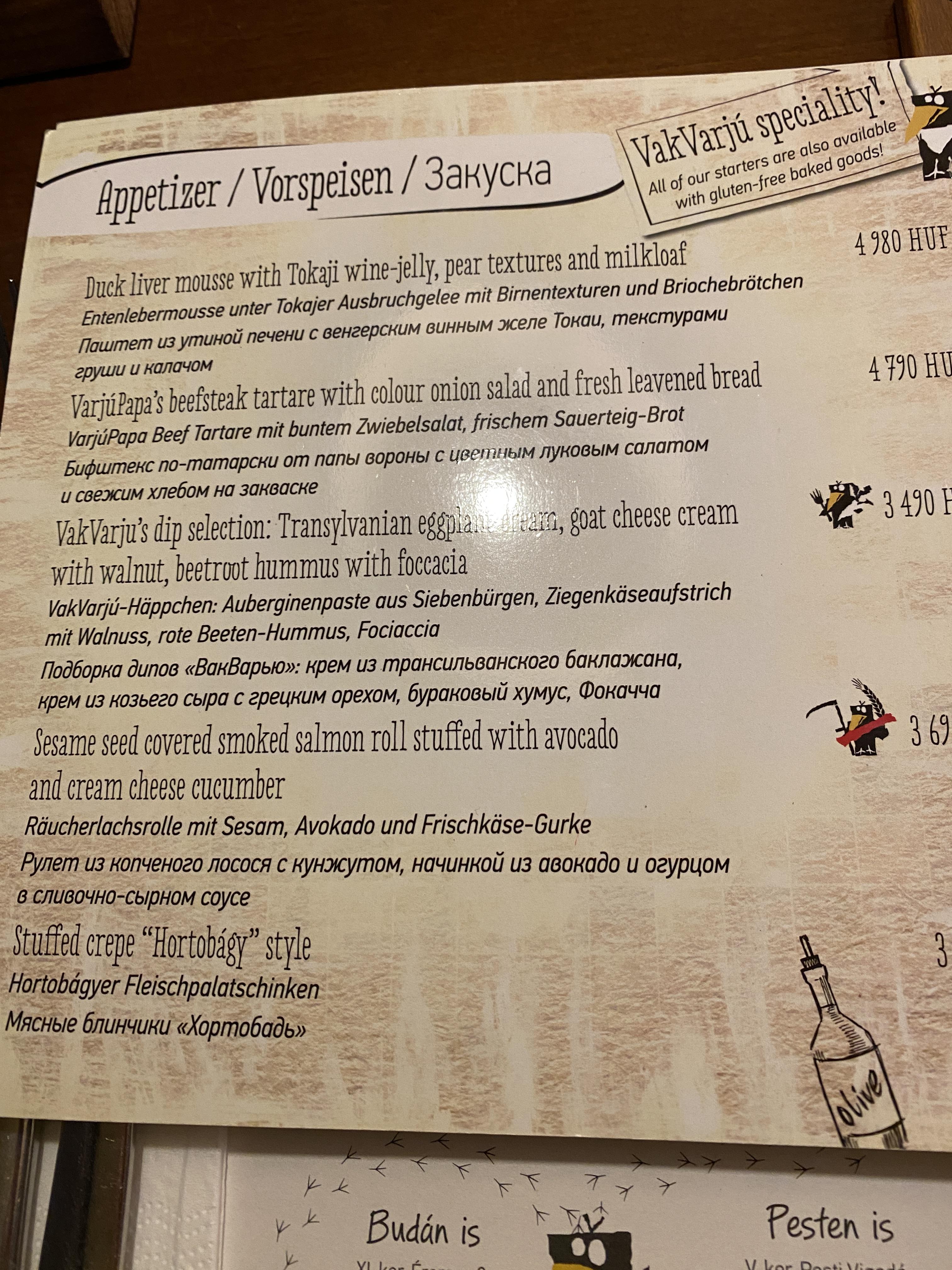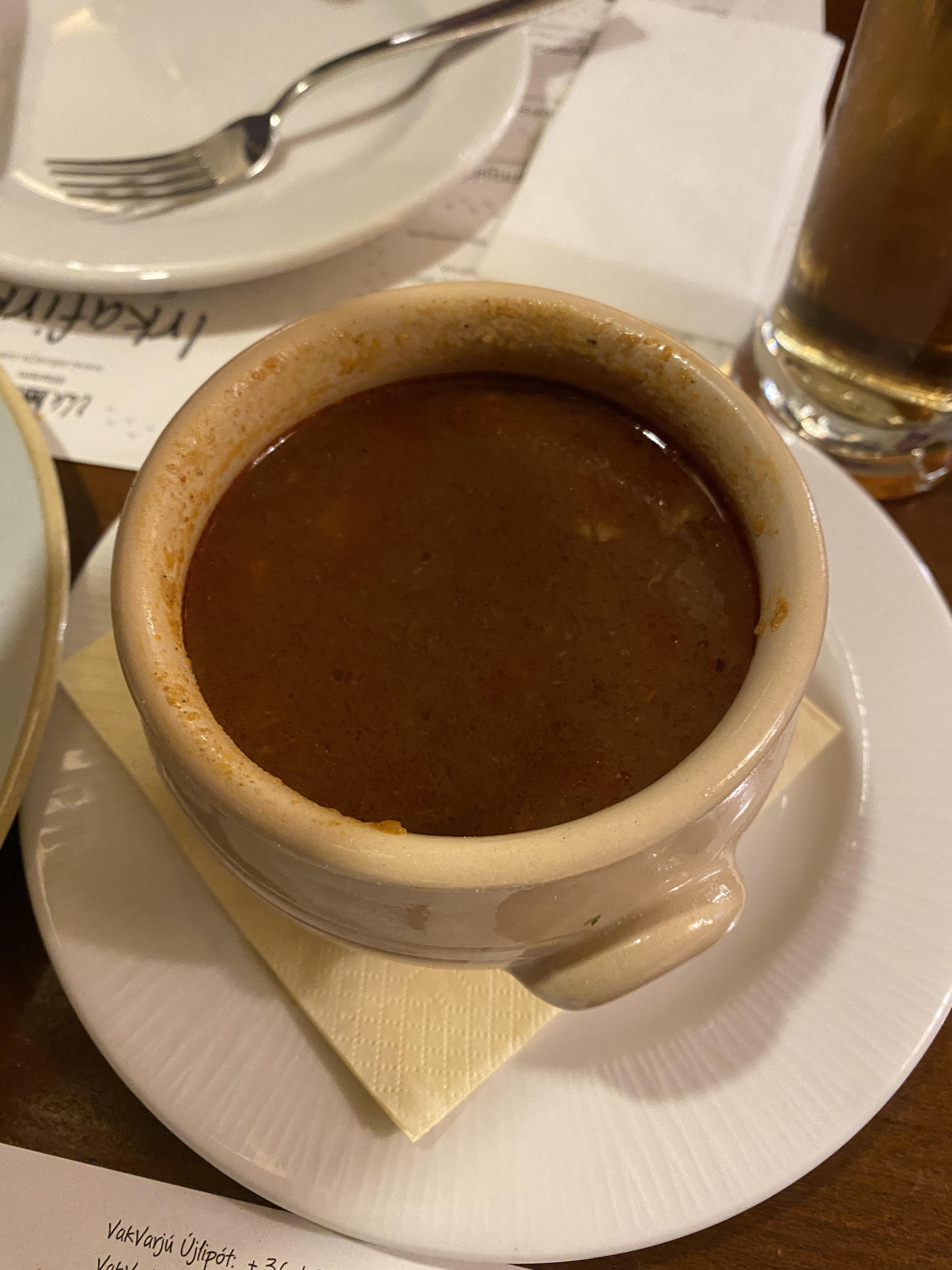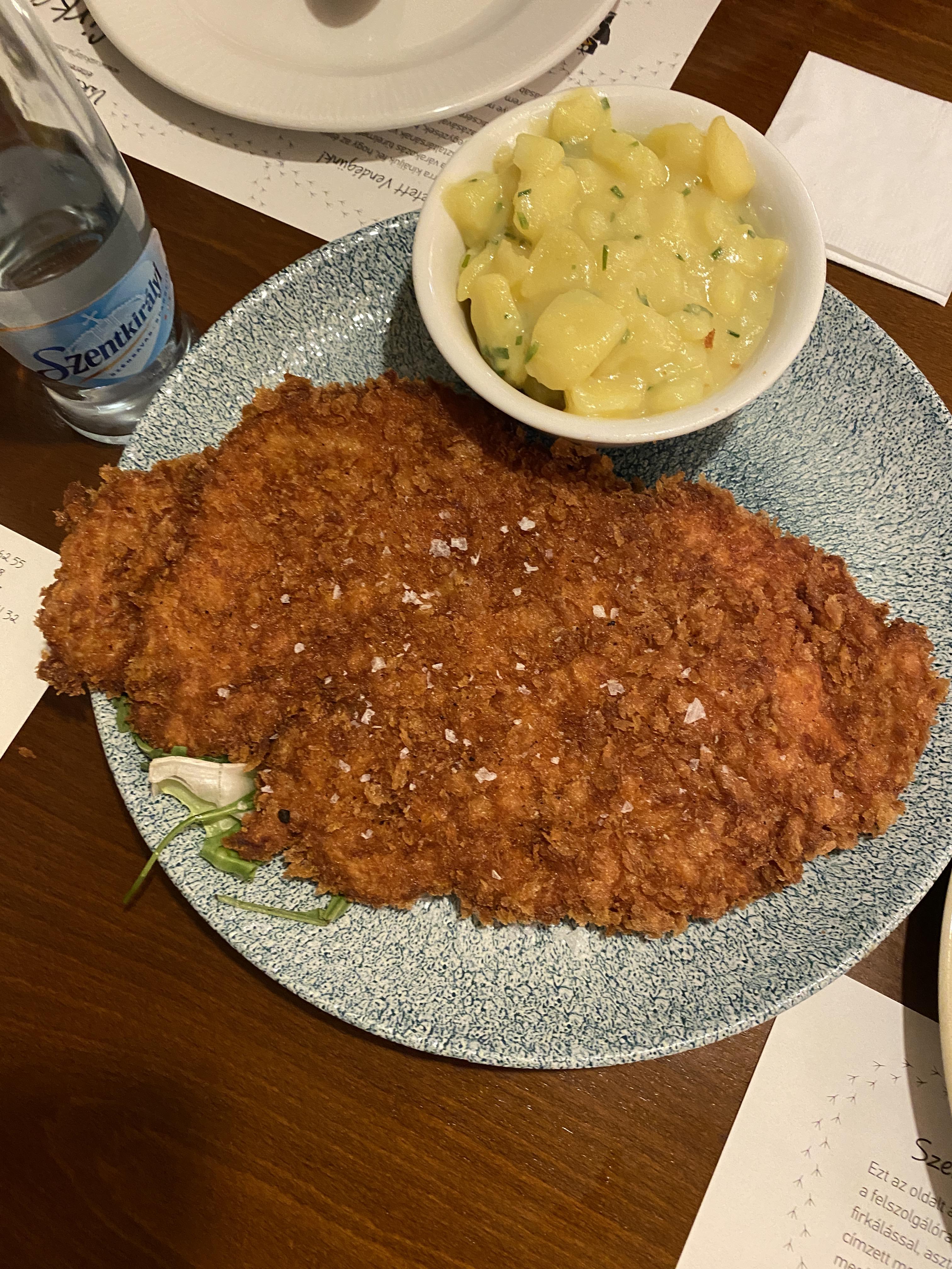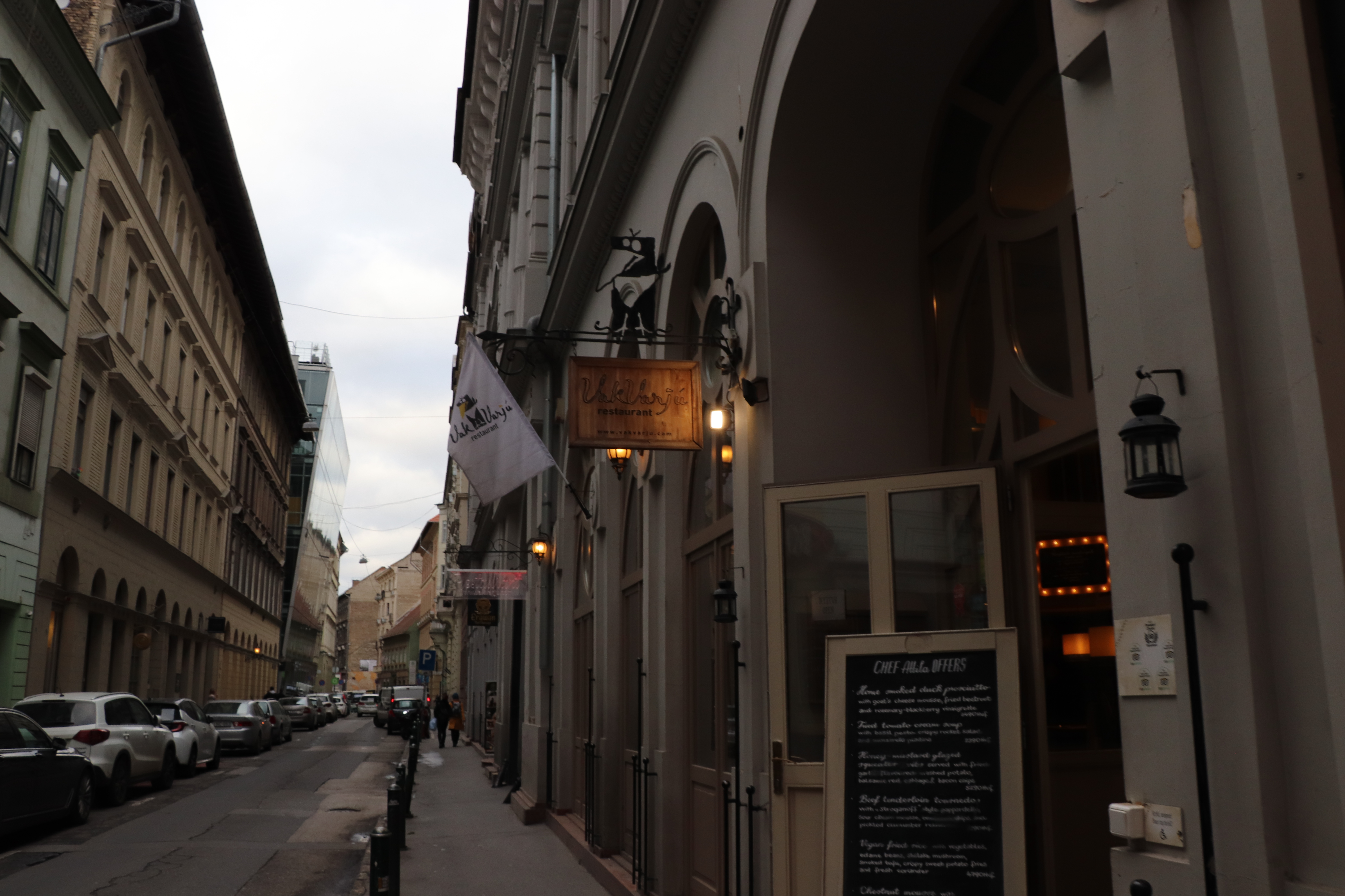 많은 시간이 있었던게 아니라 빈으로 돌아가는 기차 시간도 다가오고 해서 저녁을 먹으러 현지식을 먹을 수 있는 식당을 찾아갔다. 인터넷에서 여러 정보를 뒤져봤지만 "현지식"이라는게 사실 관광객들을 상대하는 것이다 보니 관광객들이 많이 찾는다는 그리고 한인여행객들에게 거의 모두가 추천하는 박바르주 식당 (VakVarjú Étterem Pest)을 가기로 했다. 까마귀가 상징인지 블로그 같은데 보면 다들 "까마귀식당"이라고 한다. 다른 글에서도 언급했듯이 한국어로 쓰여진 여행정보를 100% 신뢰하지는 않아서 조금 망설이긴 했지만 그래도 마땅히 다른 대안이 없어서 이 식당으로 가게 된 것이다. 바쁜 저녁시간보다 약간 일찍 도착해서 예약을 하지 않았음에도 불구하고 편하게 앉아서 식사를 할 수 있었다. 헝가리에서 한국입맛과 잘 맞는다는 굴라시 (Goulash)를 먹어보고 싶기도 해서 기대를 어느 정도 하고 갔다. 가격도 관광객들 상대인데다가 상당히 고급스러웠던 식당이어서 꽤 비싼 편이었다. 결론은 굴라시는 너무 입맛에 맞지 않아서 반 정도를 남겼고 다른 음식도 솔직히 별로였다. 특히 당근향을 극도로 싫어하는 편인데 당근맛이 국물맛에 깊이 배여 있어서 더 싫었던 것 같다. 이게 이 식당이 음식을 잘 못해서 그런지 헝가리 음식자체가 내 입맛에 맞지 않는지는 몰라도 어쨌거나 부다페스트에 다시 오더라도 두번은 안 갈 것 같다. 굴라시도 현지음식이라고 하지만 워낙에 거의 소설미디어 뿐만 아니라 모든 한국매체에서 한국인 입맛에 잘 맞는다고 했던 것 같은데 적어도 내 입맛에는 맞지 않았다. 정말 여행은 다른 사람들 말만 들으면 시야가 좁아진다고 생각하기 때문에 내가 경험하고 내가 확신이 없으면 하지 않는데 이번에는 그럴 만한 계획이 없어서 따라했다가 약간의 후회를 했다고 해야 하나. 그래도 경험을 했으니 후회라고 하고 싶지는 않다. 유일하게 맛있게 먹었던 것은 슈니첼 (Schnitzel)이었는데 이것도 오스트리아가 본고장인데 거기서는 먹지 못했던 걸 여기서 비슷한 걸 먹은 거라서 현지식과는 거리가 멀다는 점.
