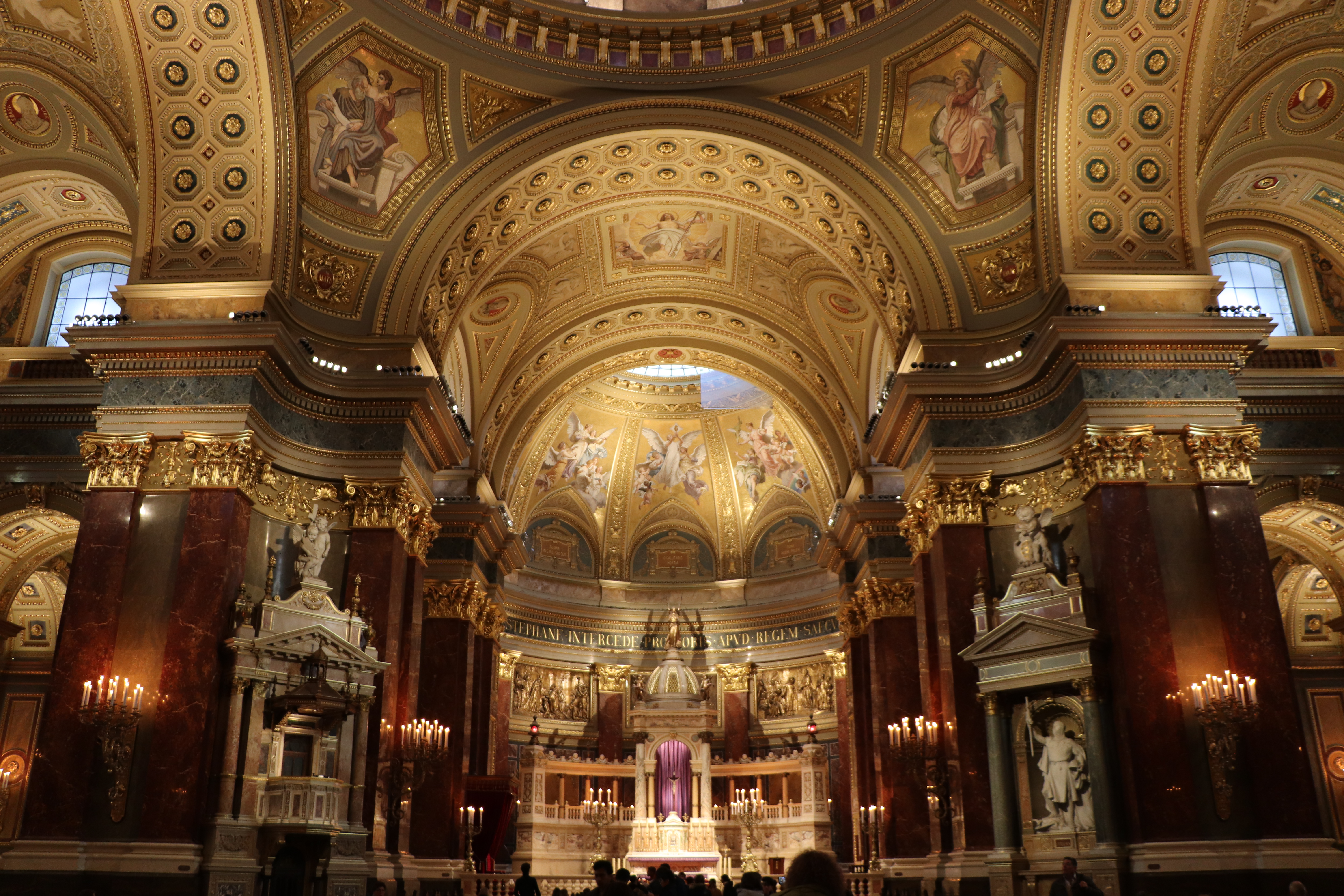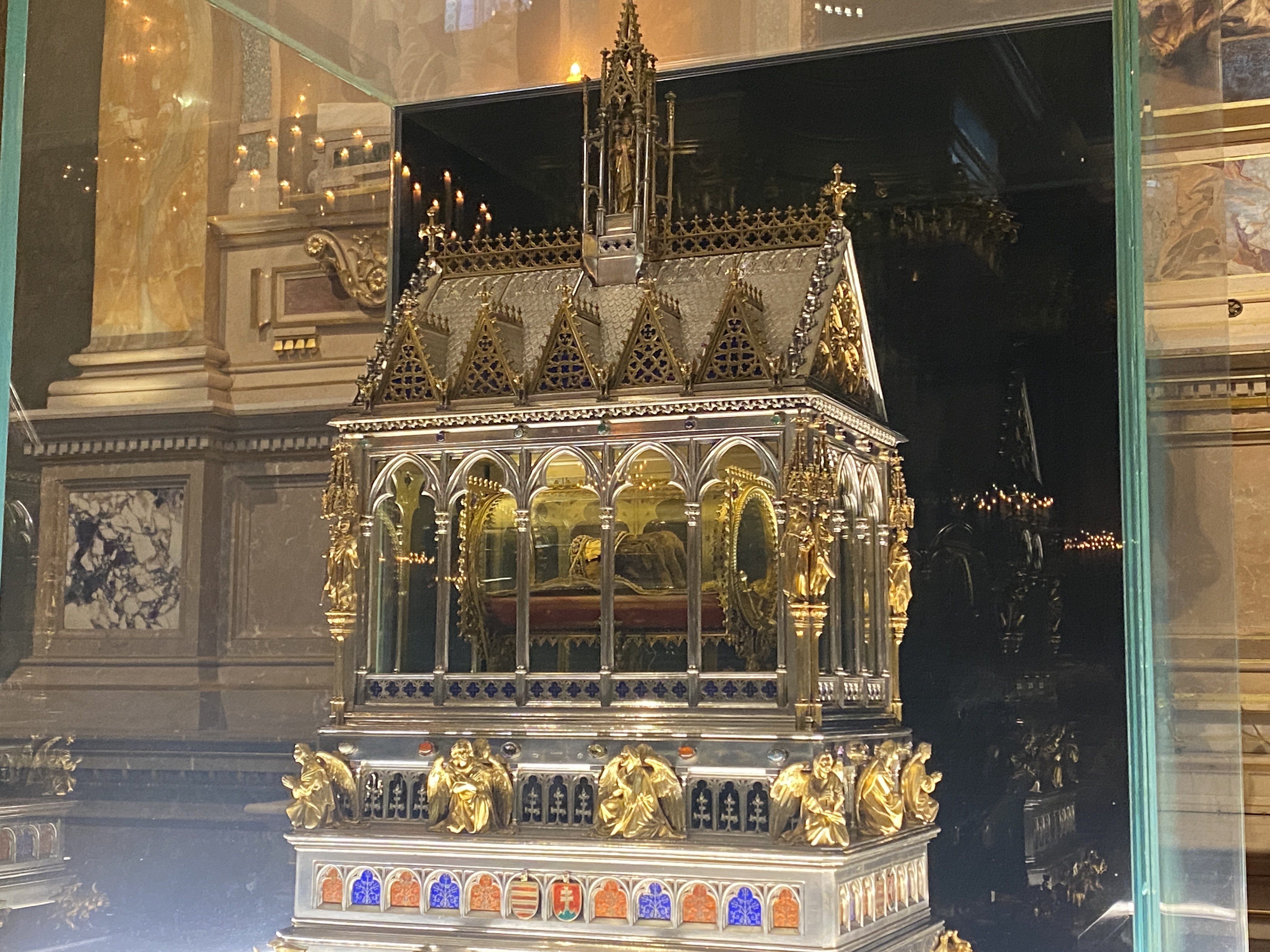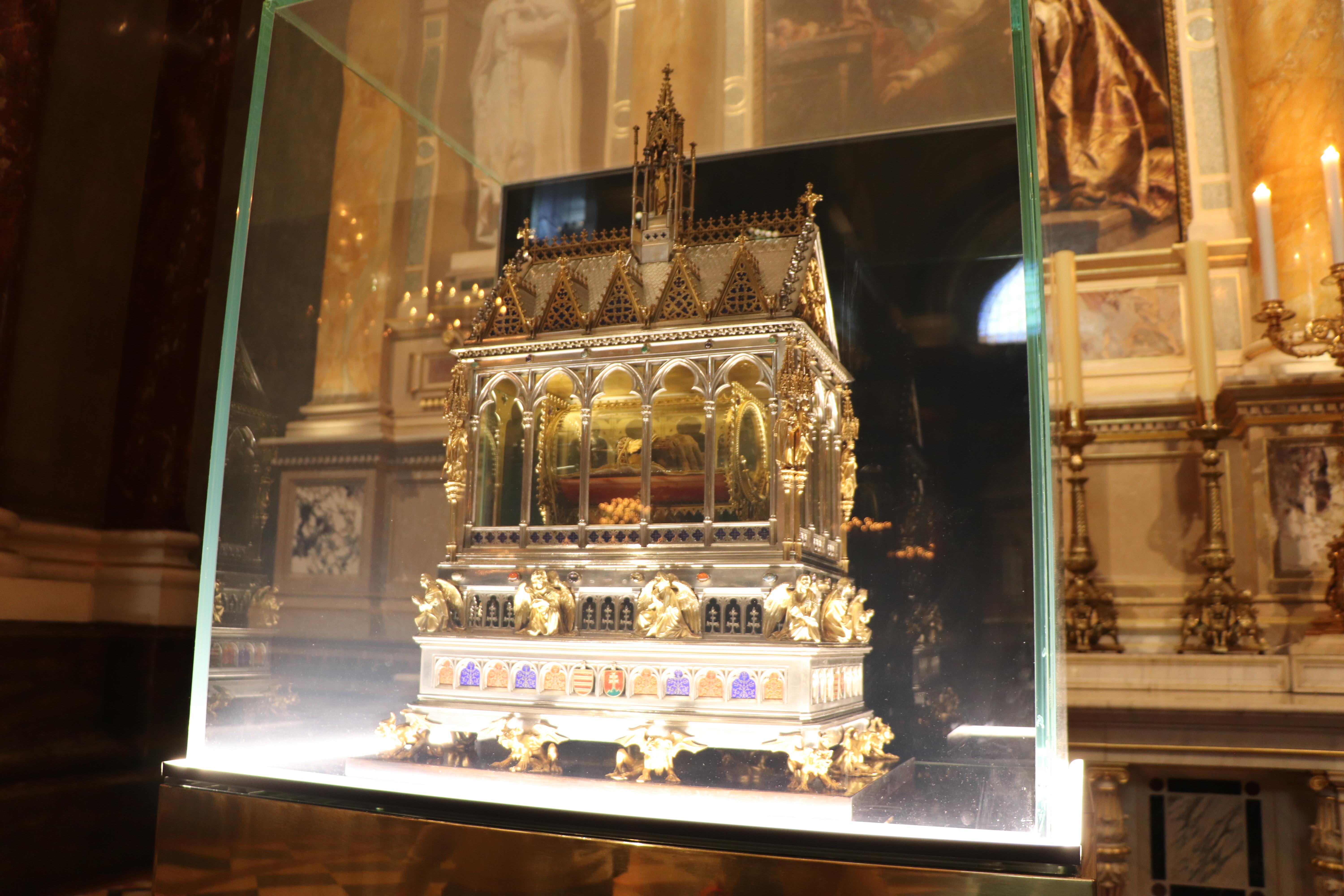 유람선을 오후 1시 반에 출발하는 편을 예매를 해서 시간이 약간 있다고 생각을 해서 부다페스트에 오면 가장 눈에 띄는 성당인 센트이슈트반대성당 (Szent István Bazilika)으로 향했다. 식당으로 오면서 벌써 지나간 곳이어서 가까운 곳에 있어서 금방 이동을 했다. 작년에 왔을 때와는 다르게 입장료를 내고 안으로 들어가 보기로 했다. 부다페스트를 대표하는 성당 답게 내부도 볼거리가 상당히 많았다. 그 중에서 가장 인상적인 것은 이 성당의 이름이기도 한 성이슈트반의 오른손 (미라처럼 처리를 해서 썩지 않는다고 한다)을 고이 모셔둔 것이었다.