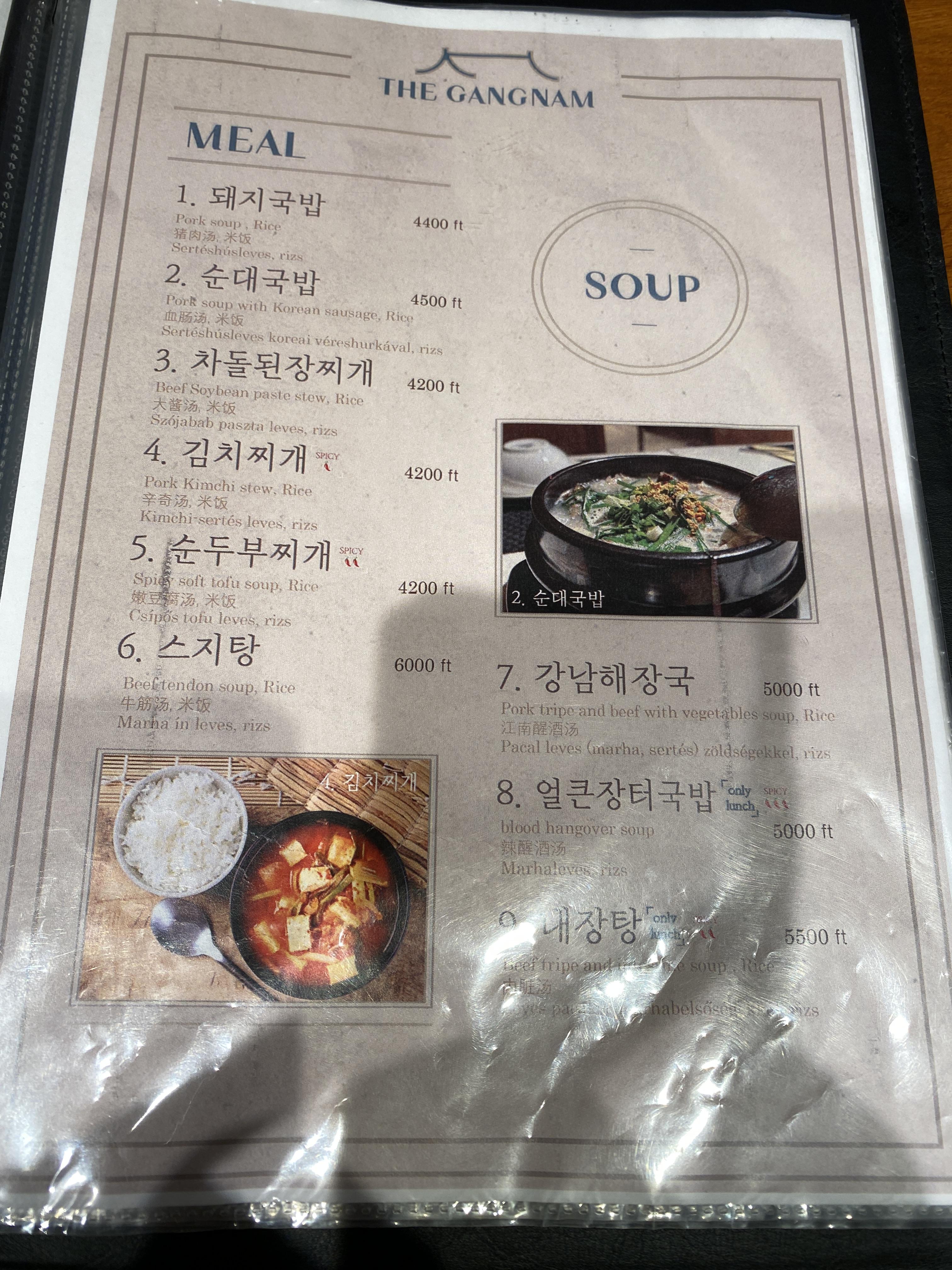 여기서도 스토리가 조금 있는데, 이날 독일에 철도 노동자들이 파업을 해서 원래 타려고 했던 기차가 "또" 취소가 되었다. 2008년에 독일에 갔을 때도 똑같이 기차 파업이 있었던 기억이 났다. 파업을 자주 하나 보다. 그래서 사무소에 들러서 그러면 이번에도 아무 기차나 타면 되냐고 물어봤더니 그렇게 하면 된다고 다시 "아무 기차도 타도 된다는" 티켓을 프린트해 주길래 받아왔다. 그런데 혹시나 싶어서 돌아 오는 기차도 아무 기차나 타면 안되냐고 물어보니 그건 자기네들 잘못이 아니기 때문에 안되다는 답변을 받았다. 어쨌거나 원래 타려는 기차는 취소가 되었고 기차가 조금 연착이 되어서 도착하고 보니 벌써 점심을 먹어야 할 시간이었다. 점심을 뭘 먹을지 고민하다가 나름 고급식당이라고 하는 그리고 위치도 비싼 지역에 있던 한식당인 "The Gangnam"이란 곳을 찾아갔다. 이곳은 돼지고기가 많이 들어간 돼지국밥, 차돌짬뽕을 비롯해서 상당히 많은 한식메뉴가 있는 곳이었다. 돼지국밥이 제일 위에 있는 메뉴 중 하나여서 이걸 시키려다가 바로 밑에 있는 메뉴인 순대국밥을 시켰다. 부산 지역에서 많이 먹는다고 하는 돼지국밥은 먹어 본 적이 없어서 그래도 자주 먹었던 순대국밥을 시킨 거였는데 먹다보니 순대국밥은 비계가 많이 들어간 돼지국밥에다가 순대만 몇 개 넣은 정도였다. 비계를 그다지 좋아하지 않아서 그렇지 음식은 꽤 맛이 있었다. 아마도 부다페스트에 다시 온다면 다시 방문할 수도 있을 정도였다.