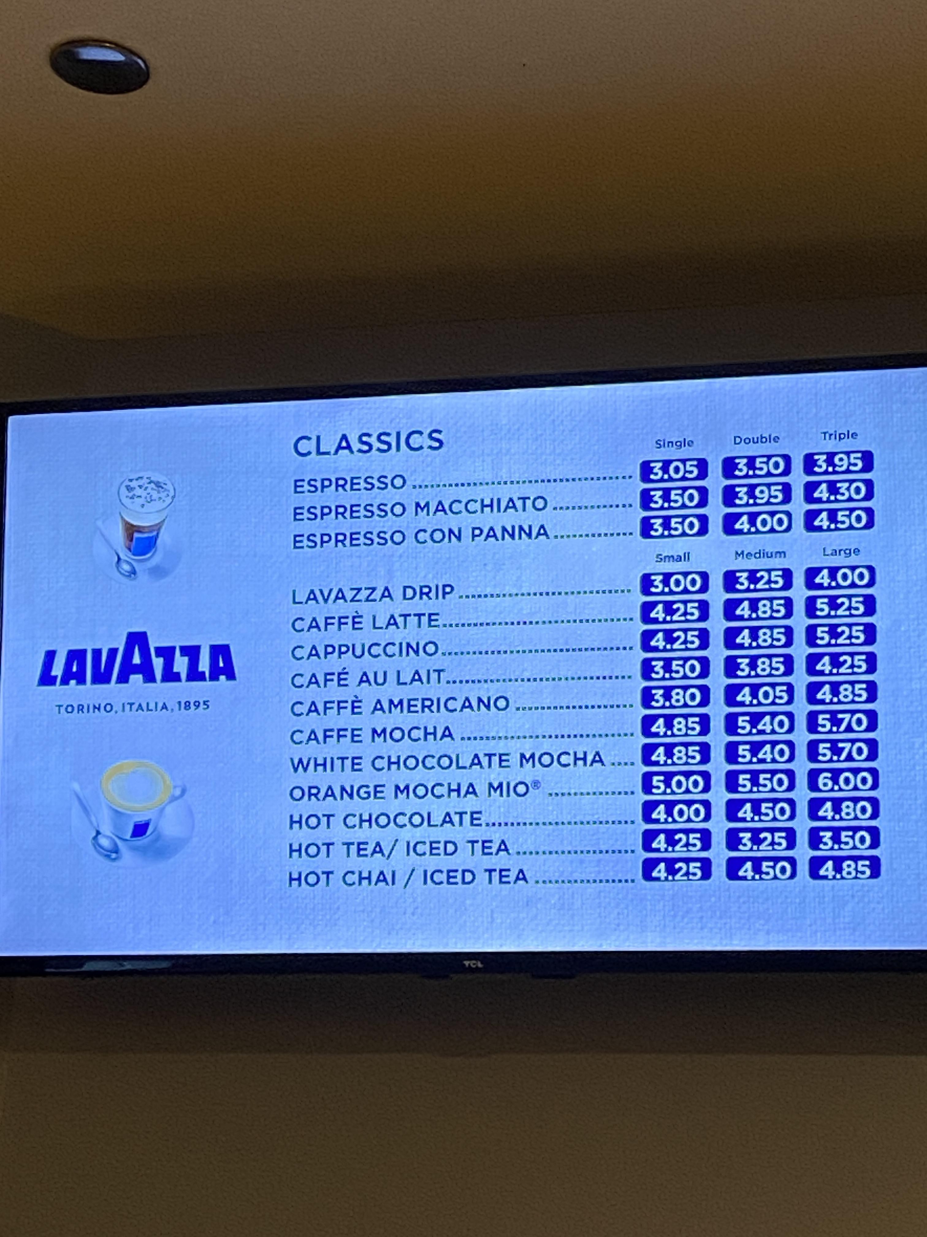 마지막으로 카페인이 좀 필요해서 호텔 근처에 있는 라바짜 (Lavazza) 커피숍을 찾았는데, 이 커피숍도 다른 호텔 (The Drake) 건물 안에 있는 쉽게 얘기하자면 호텔커피숍인데 가격이 너무 착해서 놀랐다. 저렴한 커피의 대명사 (?), 가격보다는 어디나 있는 커피가게인 (유명한 엄청난 큰 리저브 점은 위에 사진에도 있는) 스타벅스를 찾다가 더 가까운 곳에 있는 이 커피가게가 더 저렴한 것 같아서 인상적이었다.