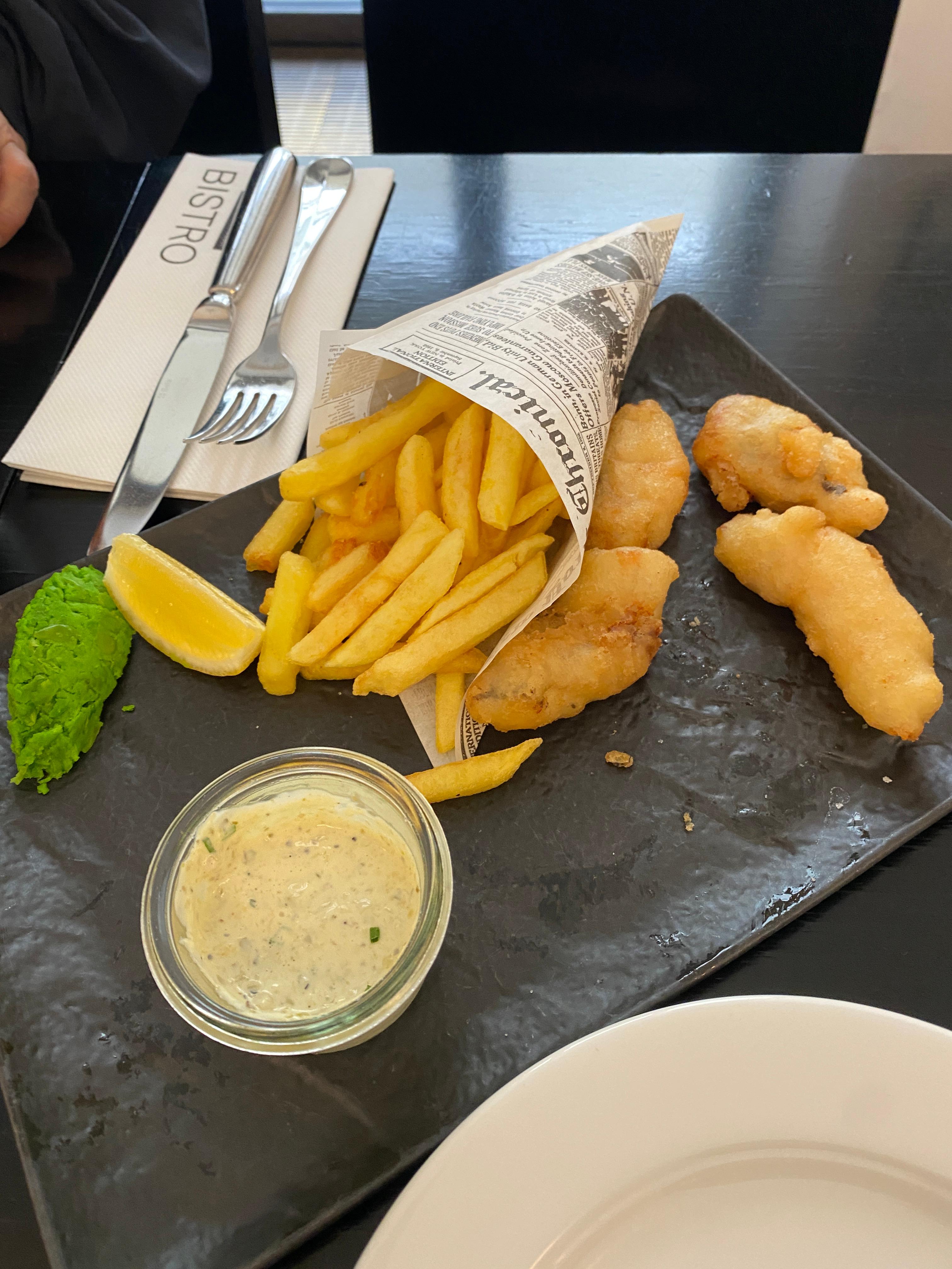 예정했던 대로 점심 시간이 다 되어서 미술관 안에 있는 식당에서 식사를 했다. 음식값은 별로 바가지라는 개념이 없는 (워낙에 다 비싸기 때문에 그럴 수도 있다) 스위스이기 때문에 특별히 더 비쌀리가 없었다. 내가 고른 음식은 영국음식인 피시앤칩스 (fish and chips). 생선튀김의 양이 작아서 실망스럽긴 했어도 꽤 맛이 괜찮았다.