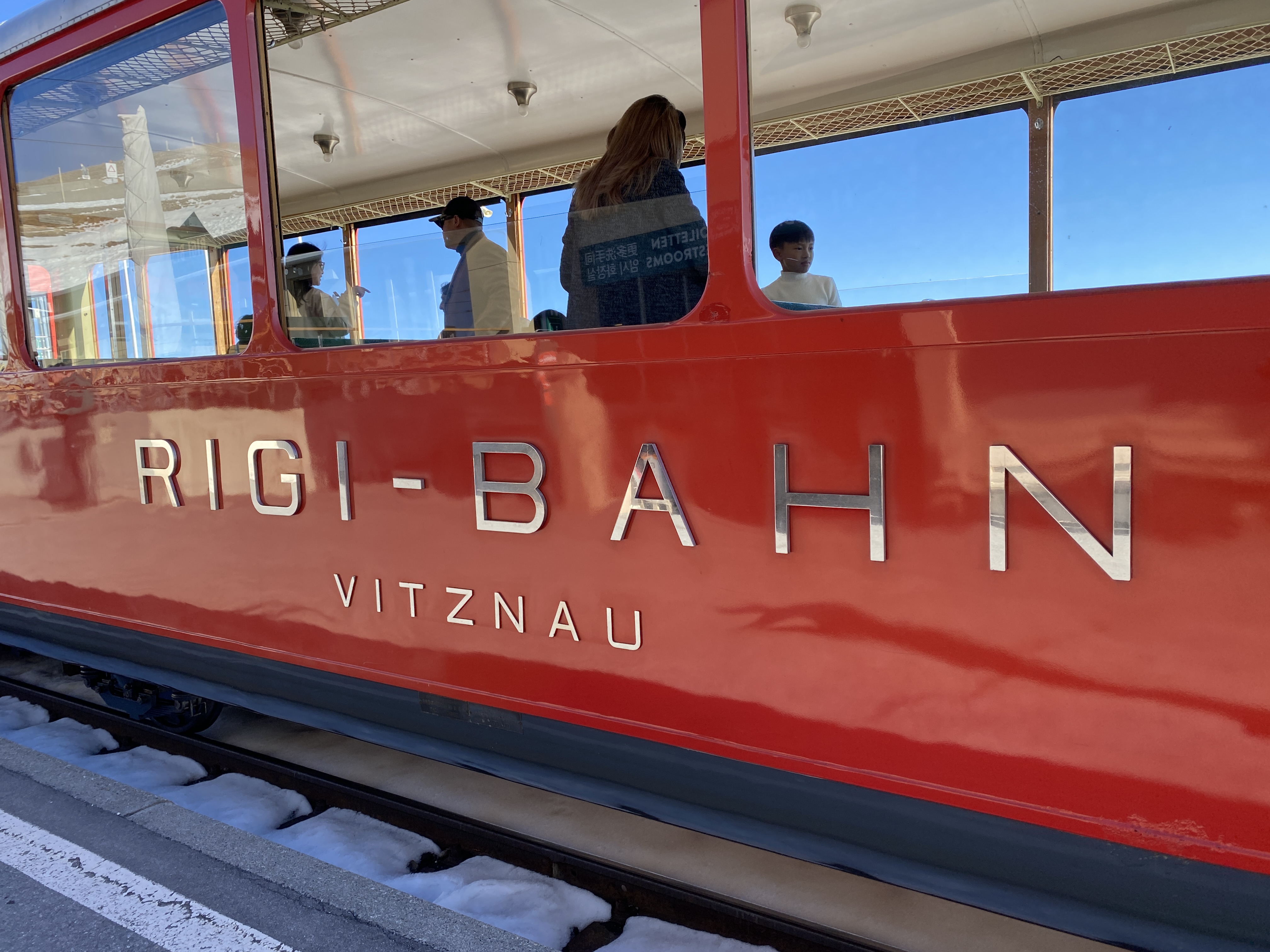 꽤 신식기차였는데 마침 같은 시간에 그룹으로 여행을 온 무리가 있었다. 관광버스와 가이드 두 명이 있는 한국에서 오신 분들이었다. 30분 남짓 올라가는 등산기차인데 가면서 보이는 마을도 무척 예뻤고 산 중턱에 있는 호텔로 오가는 사람들도 있어서 왠지 여행의 기분이 들었다. 스위스가 자랑하는 등산기차는 대부분 톱니바퀴가 중간에 있는 방식인 것 같았다.