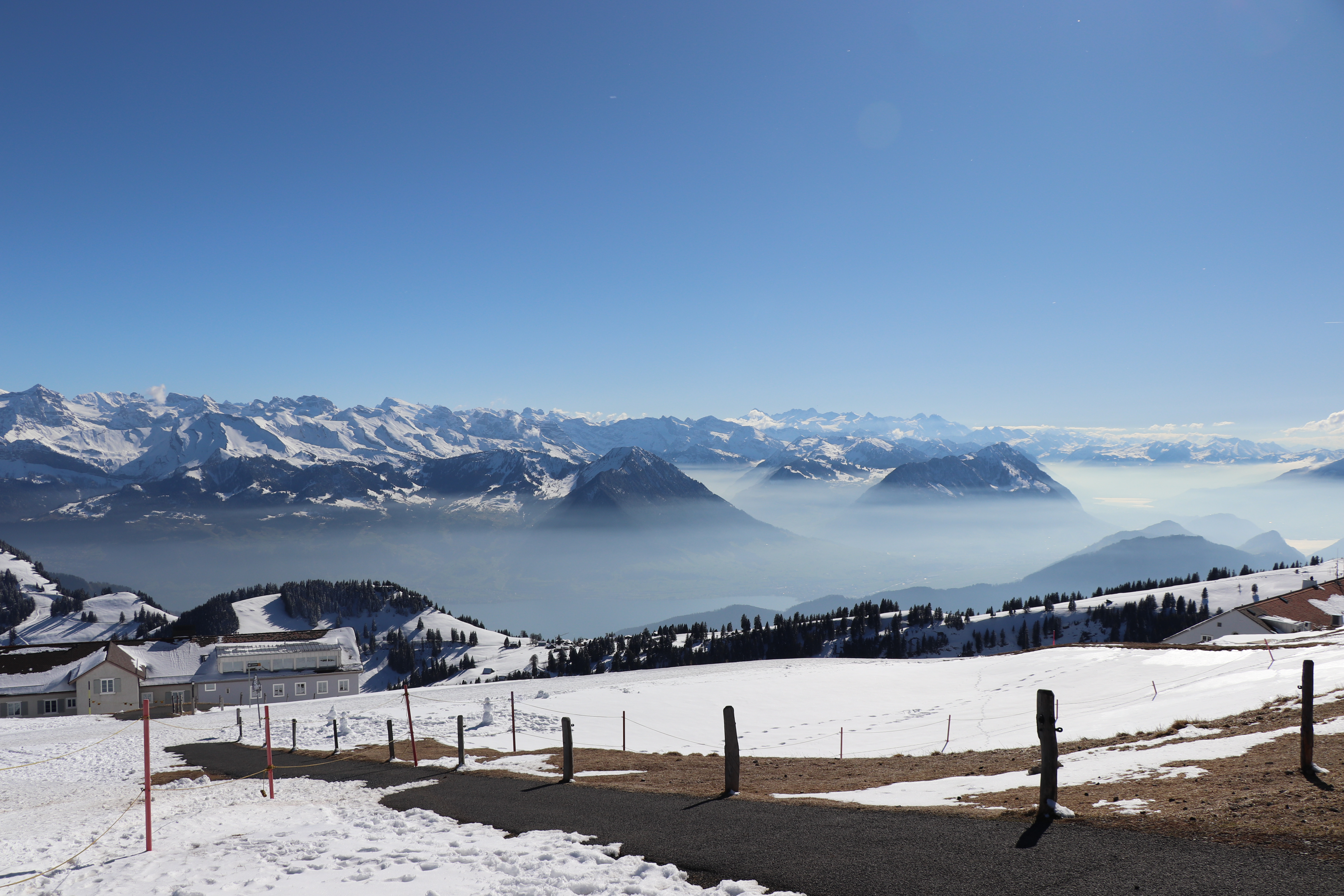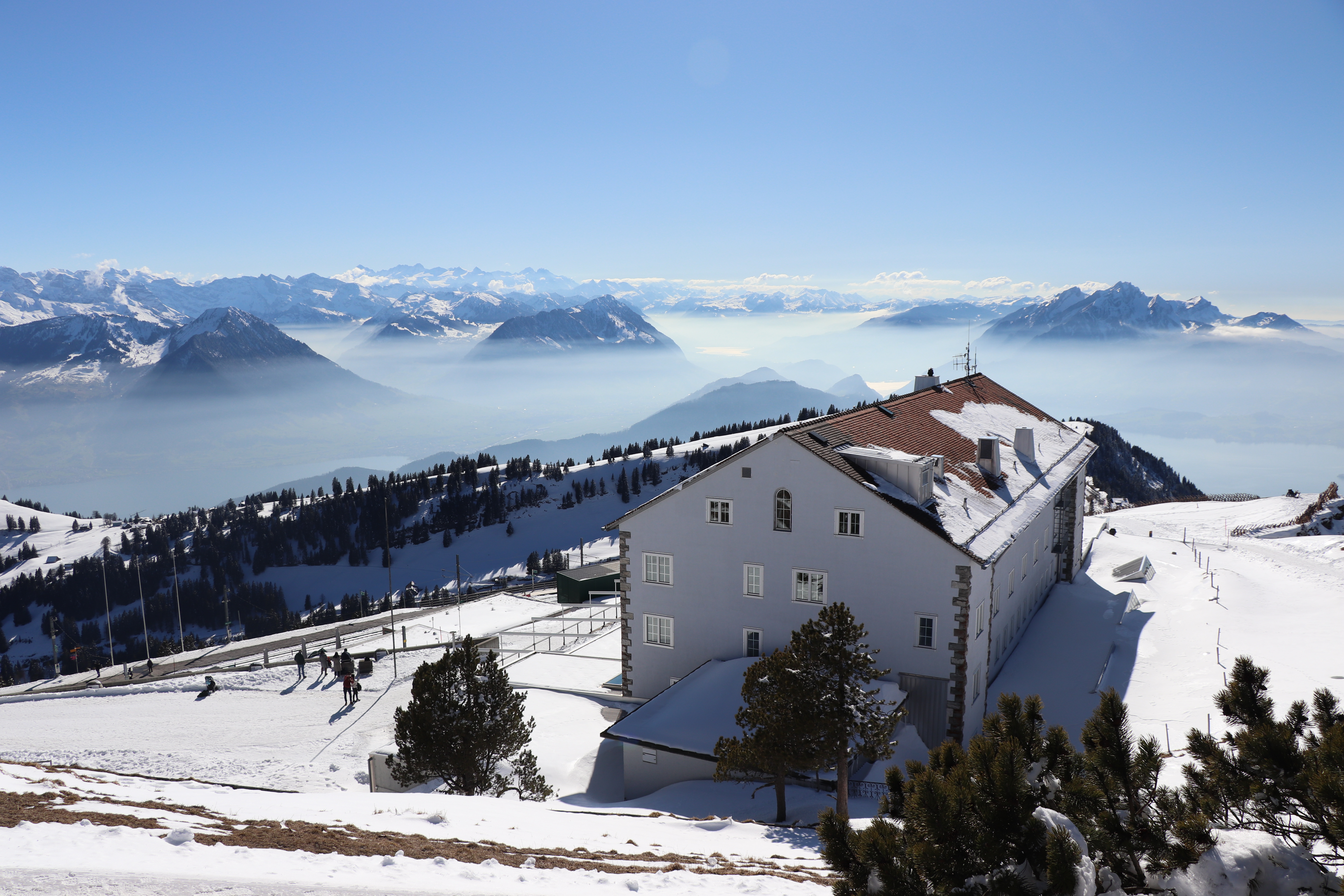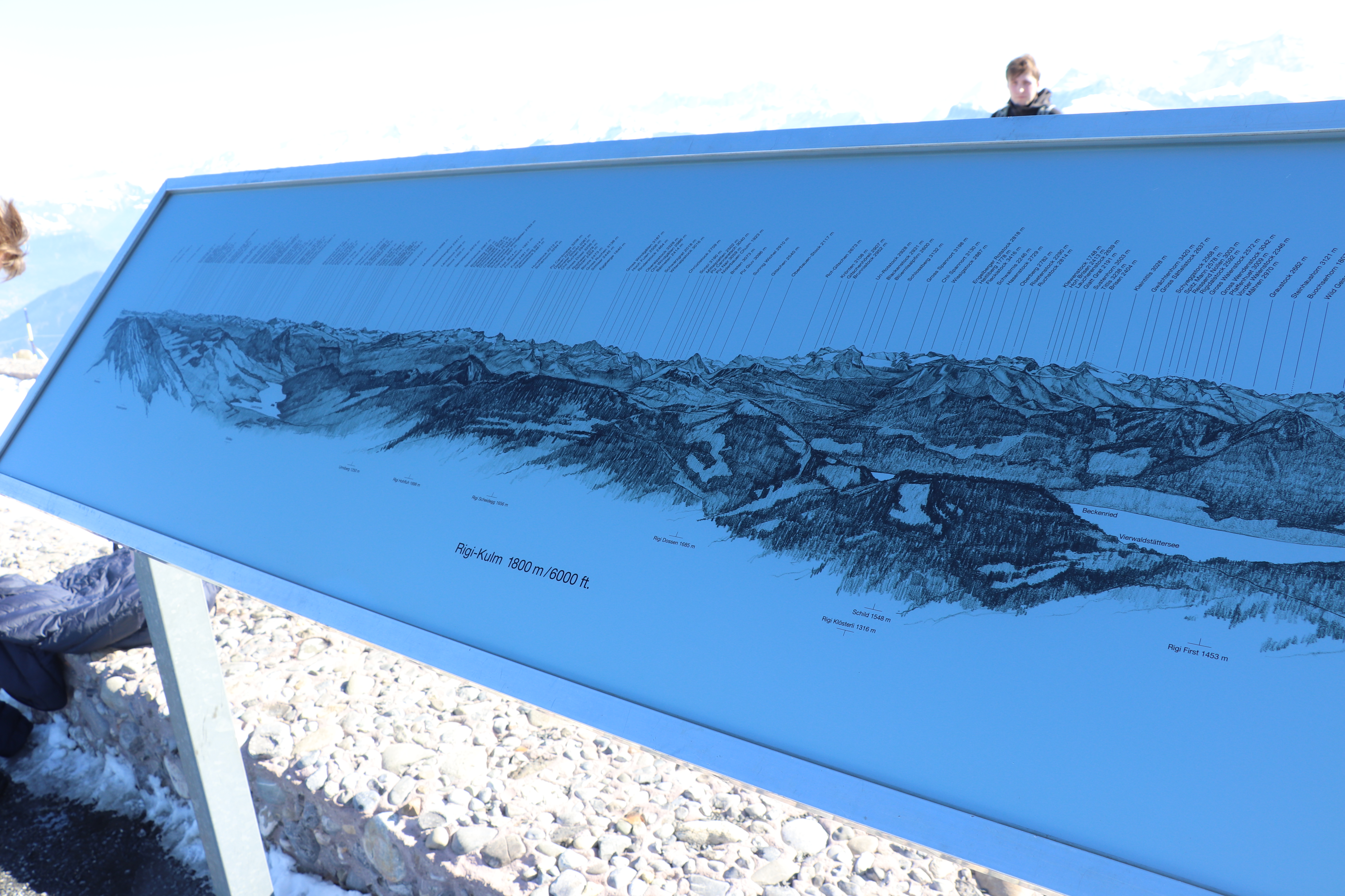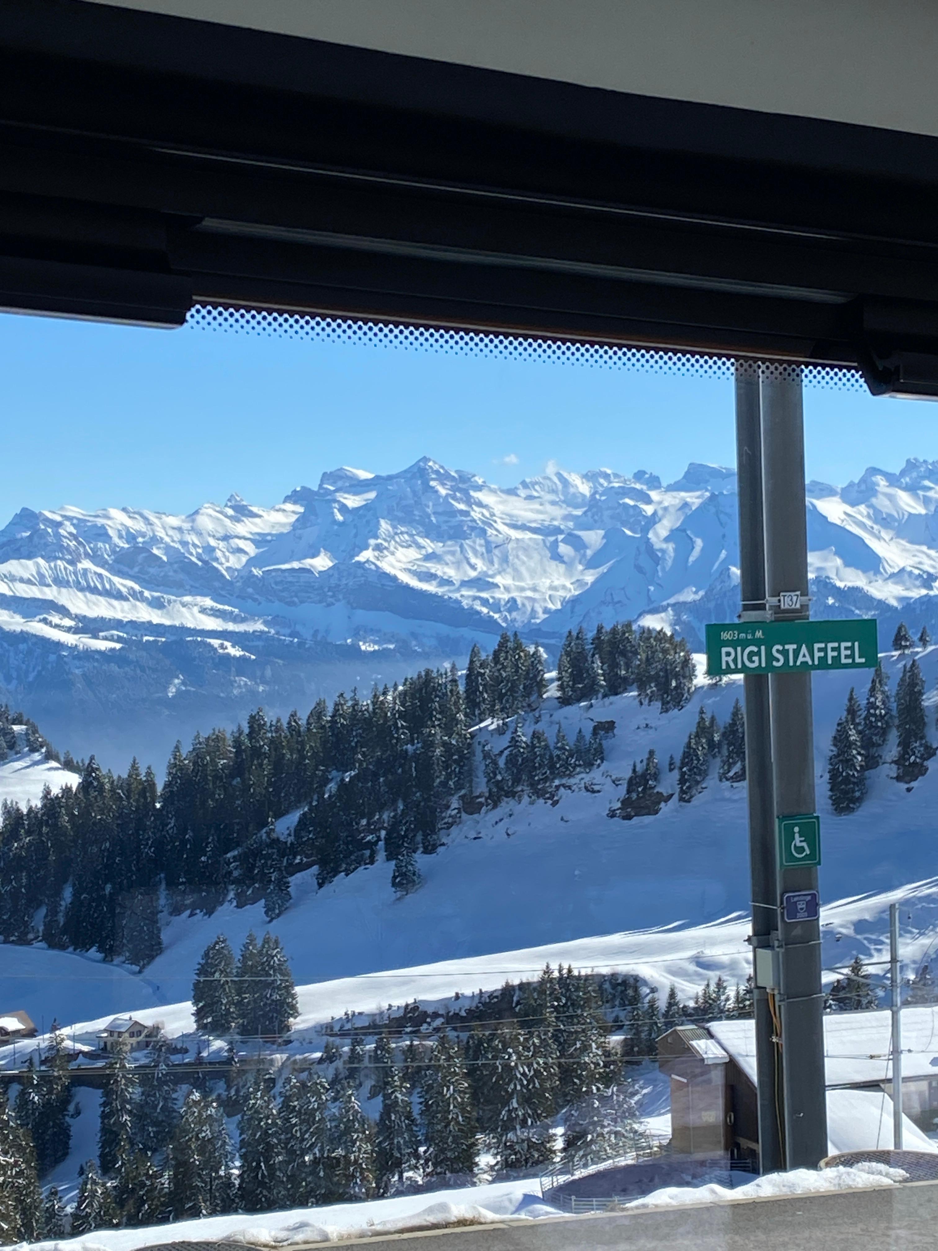 그래도 여기까지 쉽게 기차로 올라왔으니 정상까지 15분 정도 눈길을 올라갔다. 산들의 여왕 (Queen of the Mountains)라는 별명이 있는 리기산의 위용을 충분히 느껴볼만 하다. 정상이 1800미터라고 한다. 스위스 알프스에서는 3000미터가 넘는 산들이 많기 때문에 1800미터는 고도로 따지면 아주 낮은 편이긴 하다.