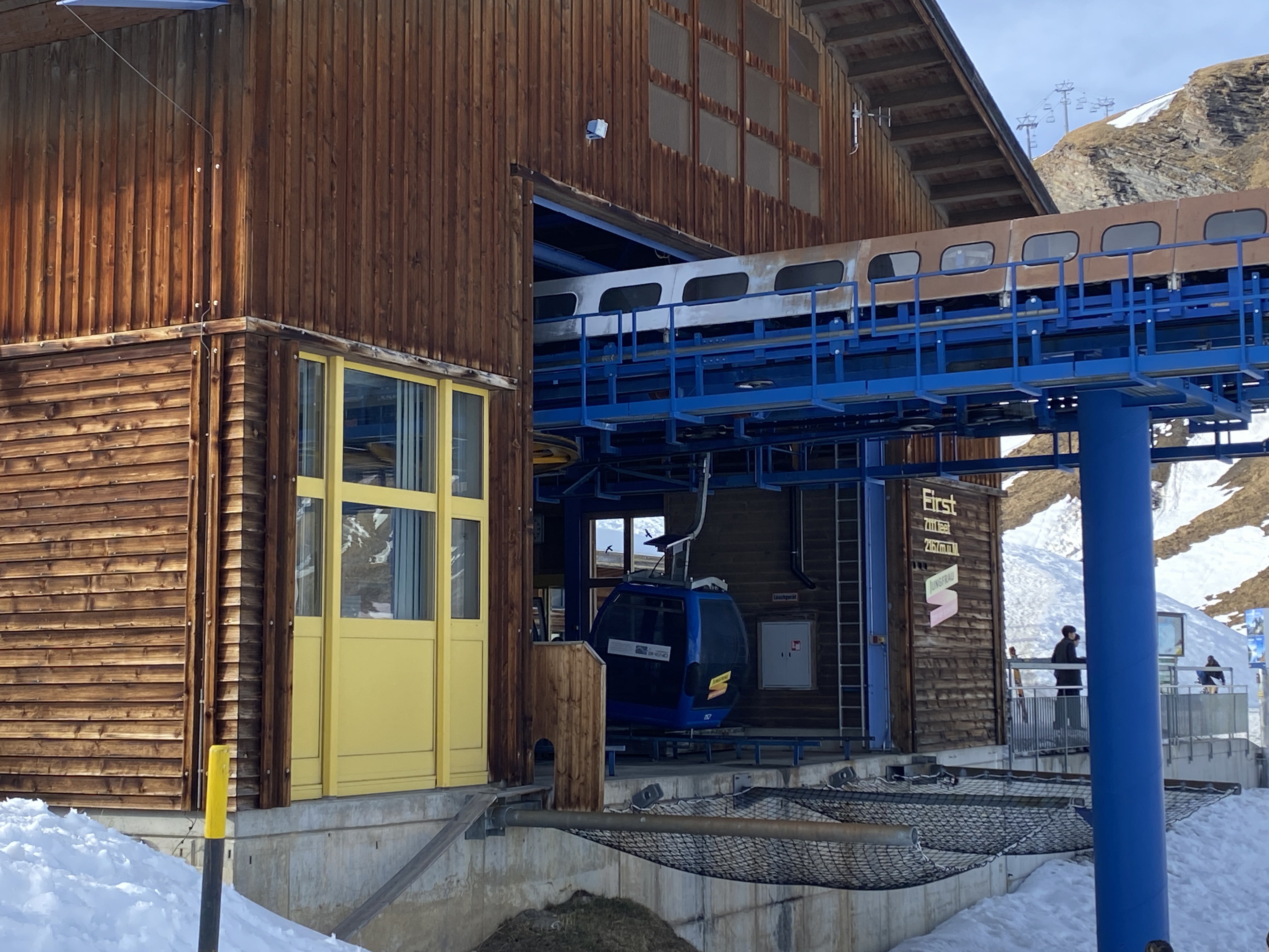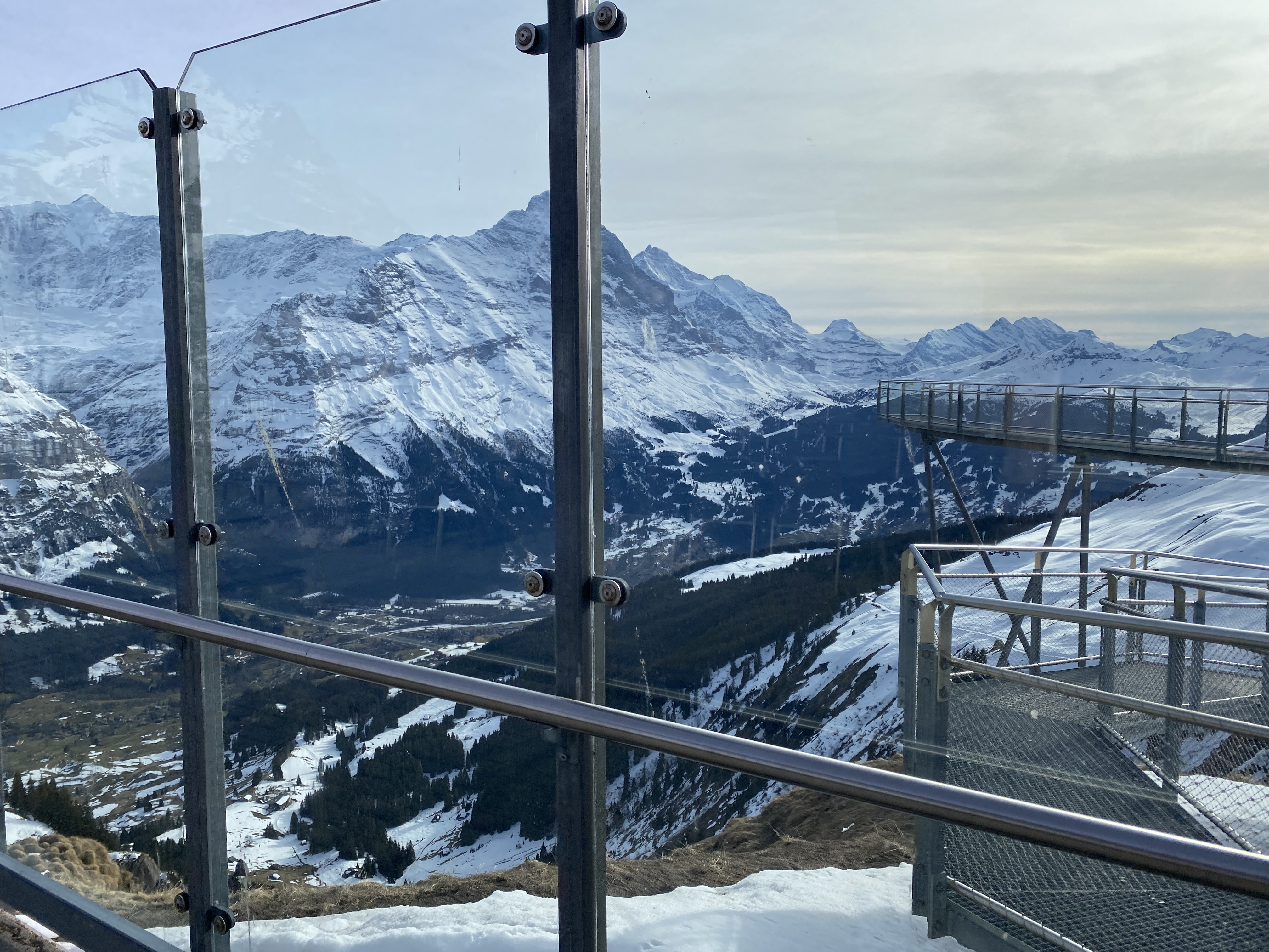 피르스트에 드디어 올라왔다. 융프라우는 이제 거의 보이지 않는 쪽에 온거다. 눈이 많이 쌓여있어서이기도 하고 마감시간이 다 되어서 어디로 갈 지 모르고 있다가 어떻게 한 층 더 올라가니 그림같은 전망대가 보였다. 피르스트 클리프 워크 (First Cliff Walk)라는 곳인데 전망대의 끝에서 몇몇 무리의 사람들이 사진을 열심히 찍고 있었다. 나도 비집고 들어가 사진을 쌩하니 찍고 나왔다. 사진을 찍고 있는 중에 이제 내려가는 곤돌라 마감이 5분 밖에 안남았다고 안내를 들었다.