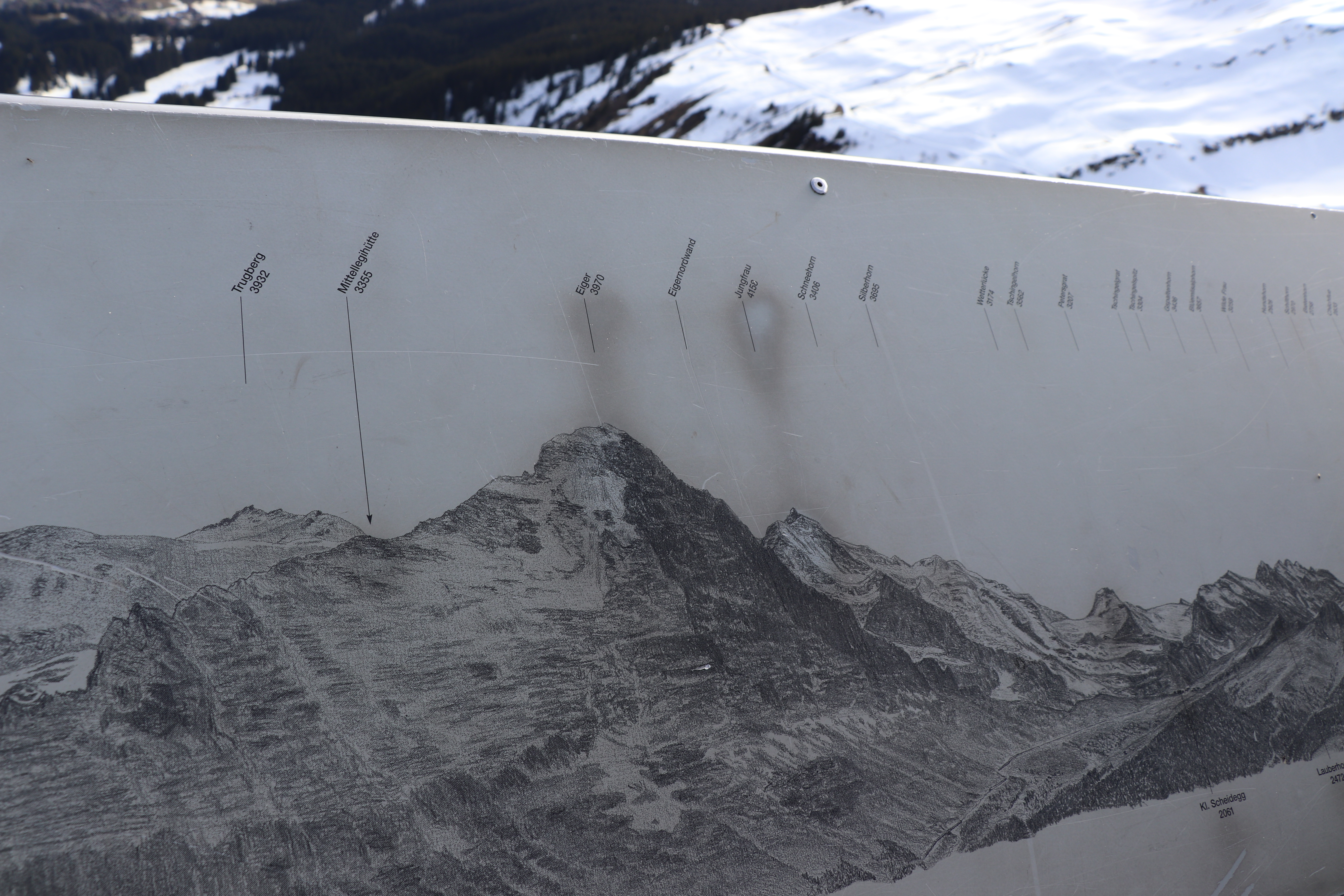 피르스트의 전망대에선 이쪽이 아이거와 가까운 곳이어서 뮈렌에서는 융프라우를 가까이 볼 수 있고 여기는 아이거가 가까이 보인다. 아이거의 북벽 (North Face)가 아니라 그 반대편이 잘 보이는 곳이다.
