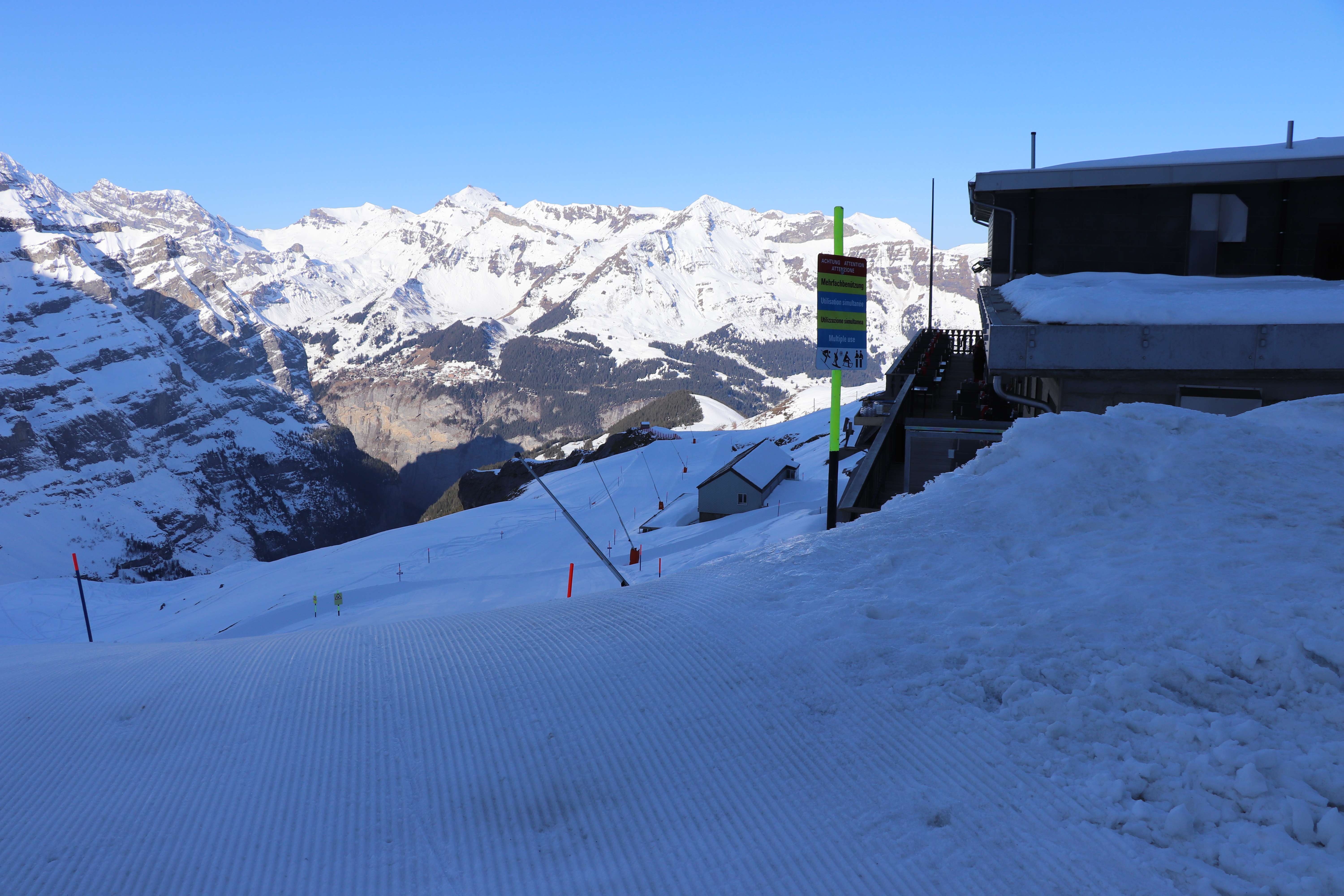 난 다시 그린덴발트 터미널로 가는 곤돌라를 탈 예정이었는데 따로 전망대는 없어도 곤돌라에서 내리면 스키를 타고 내려갈 수 있는 평평한 곳이 있어서 여기서는 융프라우의 모습을 상당히 가까이 볼 수가 있다. 꽤 높은 곳인데 그래도 2320미터라면 고산병이 올 정도는 아니라서 쾌적하게 경치를 감상할 수가 있다. 곤돌라를 타고 내려가는 길이 얼마나 경치가 좋을까 상상이 된다.