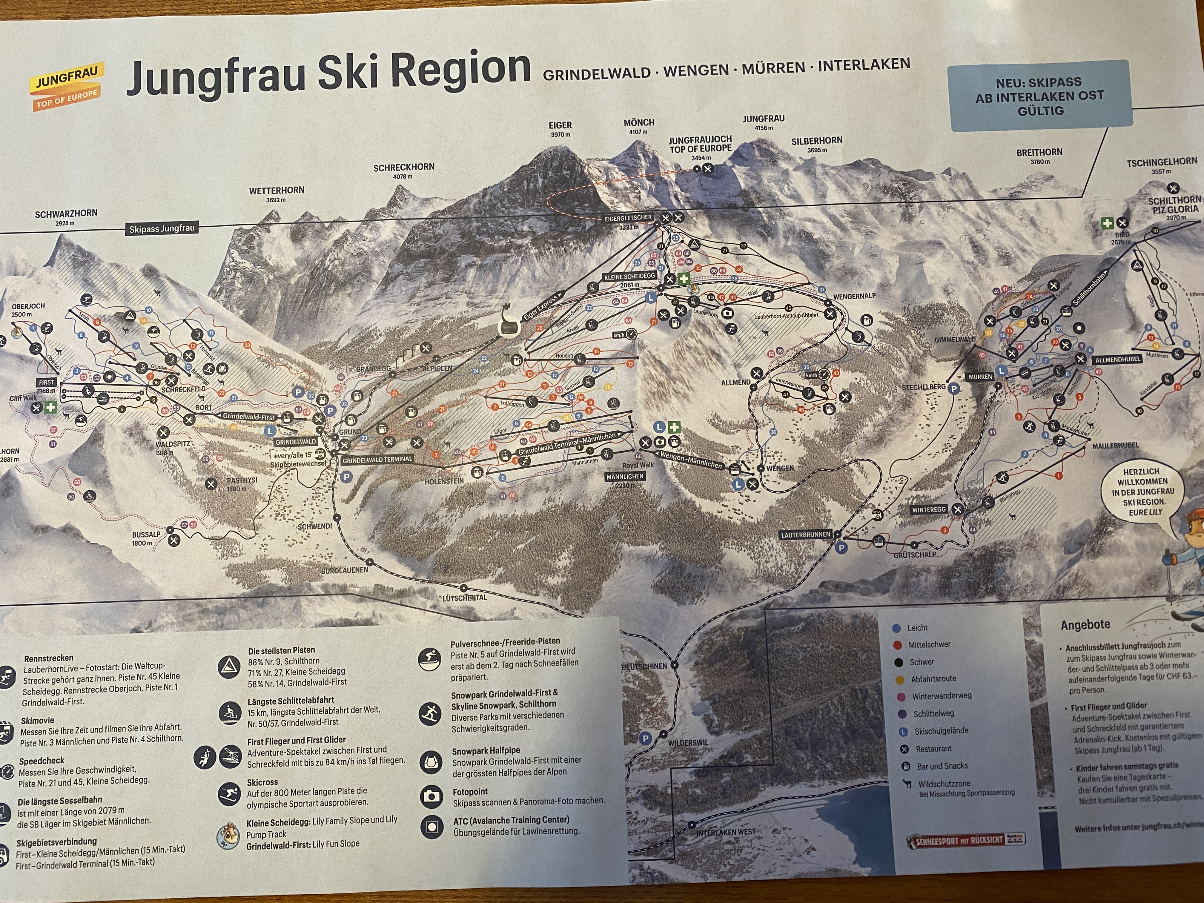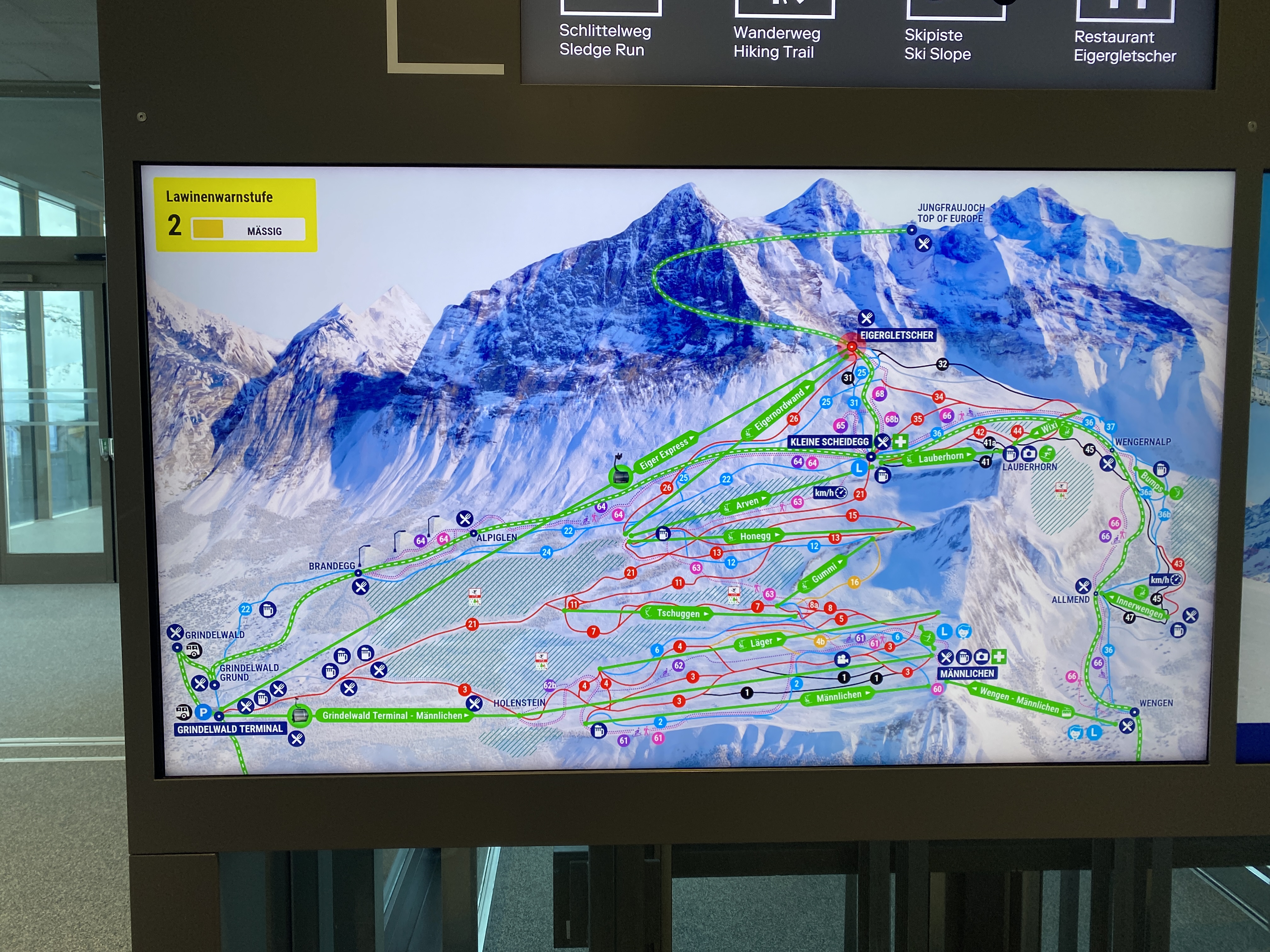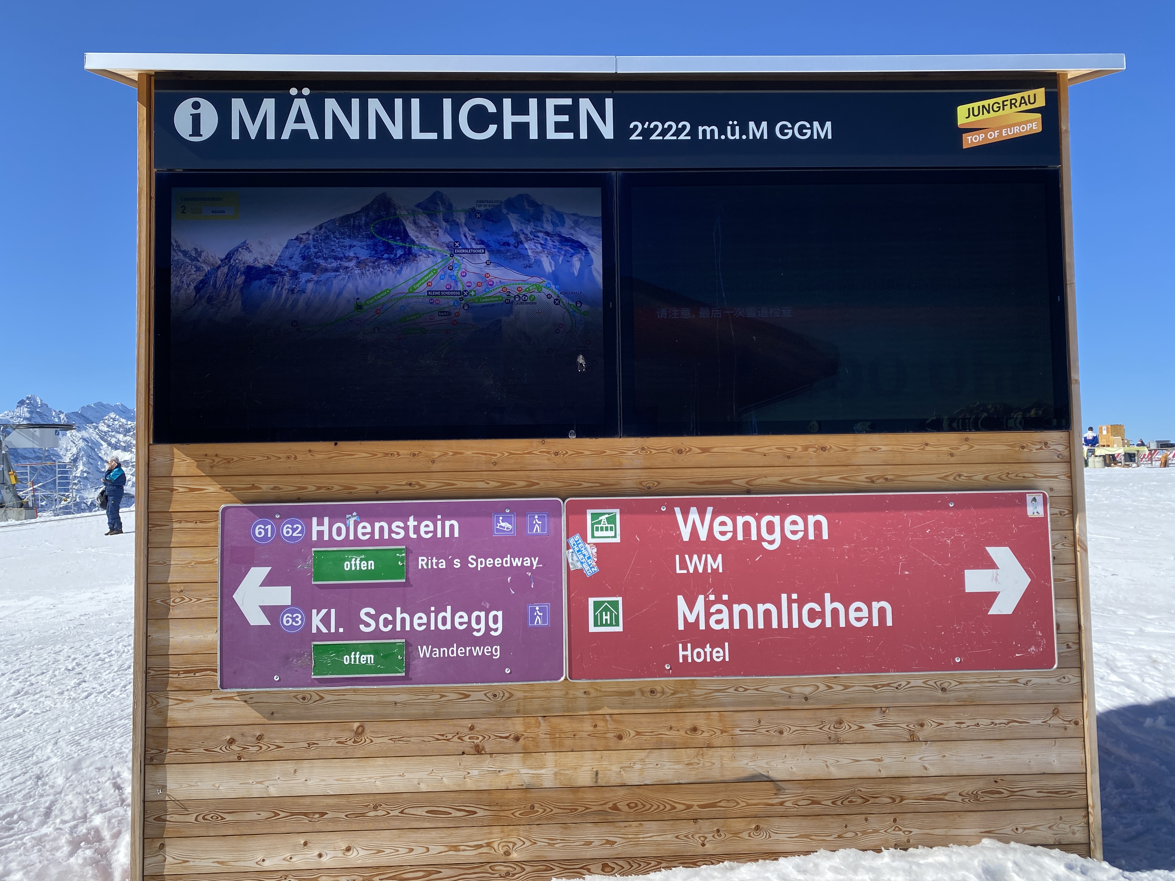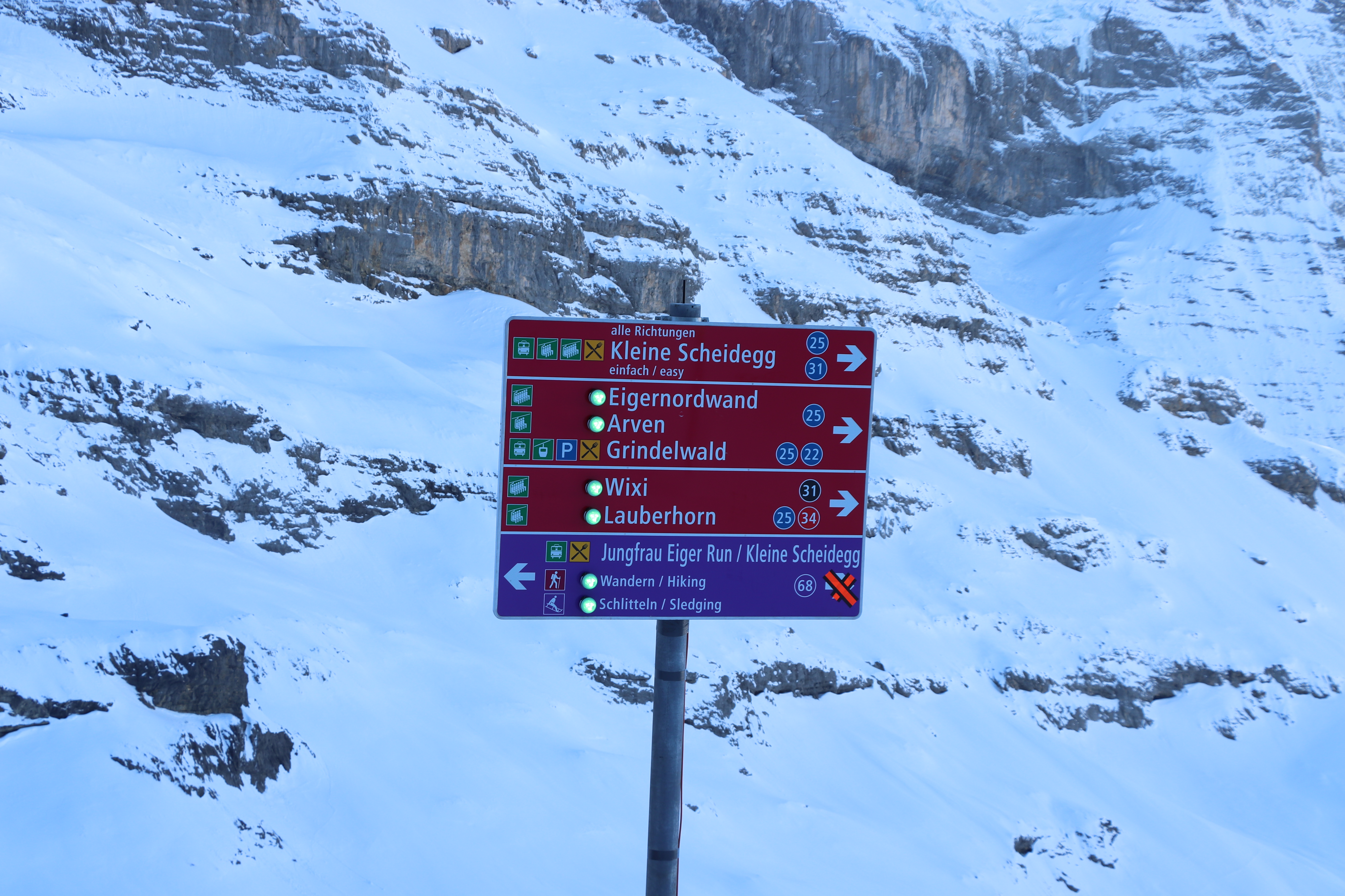 스위스패스나 하프페어패스를 안 산 이유가 차로 갈 수 있는 곳은 차로 가려고 했기 때문에 예전에 한 번 가봤던 융프라우요흐 (Jungfraujoch)까지 가는 기차표는 가격이 너무 비싸 부담스러웠다. 그리고 예전에 갔을 때 너무 높은 지역이어서 고산병으로 머리가 너무 아팠던 기억 때문에 정말로 가고 싶지가 않았다. 그래도 융프라우는 가까이서 보고 싶어서 클라이데샤이덱을 선택을 한 거였는데, 그린델발트 터미널에서 주차를 하고 그룬트 (Grund) 역에서 표를 사려고 물어보니 겨울시즌에 스키를 타지 않으면 하루 61프랑 (CHF61)을 내면 융프라우요흐만 빼고 융프라우 지역 안의 모든 기차/리프트/곤돌라를 탈 수 있다는 것이다. 그래서 망설이지 않고 그 표를 샀다. 그리고 계획도 변경해서 왠만한 거 다 타보자 싶었다.
