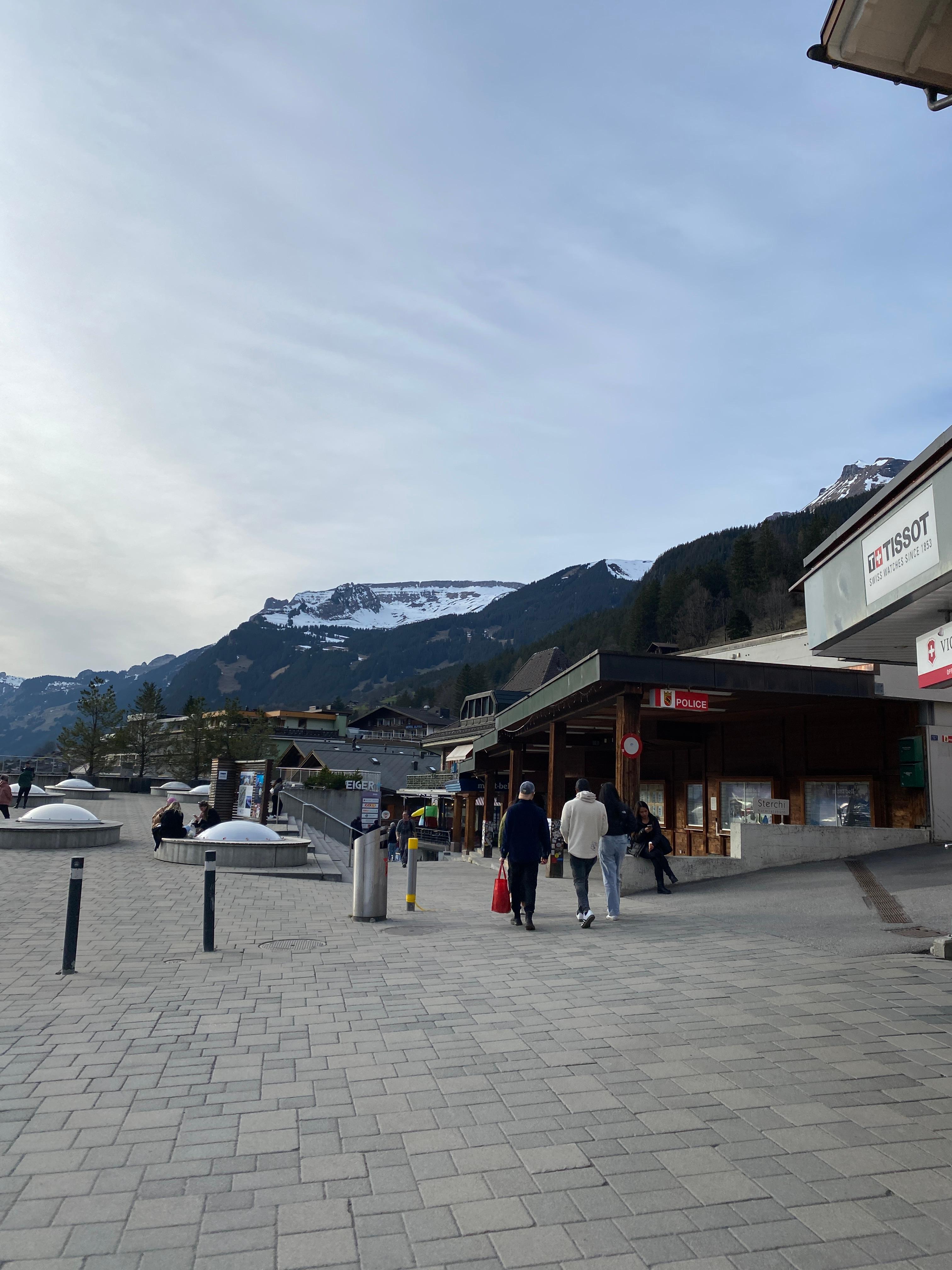 막차는 아니라도 빨리 내려가라는 안내를 받고 내려가는 곤돌라를 서둘러 탔다. 다시 그린델발트로 돌아와서 역까지 또 한참을 걸어갔다. 피곤함을 달래려고 아이스크림도 사서 한입 먹으면서 기차역으로 갔다. 기차역에 간 이유는 차가 있는 주차장까지 가려면 버스로도 갈 수 있지만 현금도 없고 스위스 패스도 없고 버스를 탈 방법이 없어서 기차를 타고 2분 정도 걸리는 그린델발트 터미널 역까지 가야 했기 때문이다. 주차를 그 쪽에 했기 때문에 그래도 가장 현명한 방법이라고 생각했다. 그린델발트는 여행객들이 선호하는 숙소가 많아서 꽤 상점도 많고 부산한 느낌마저 들었다.