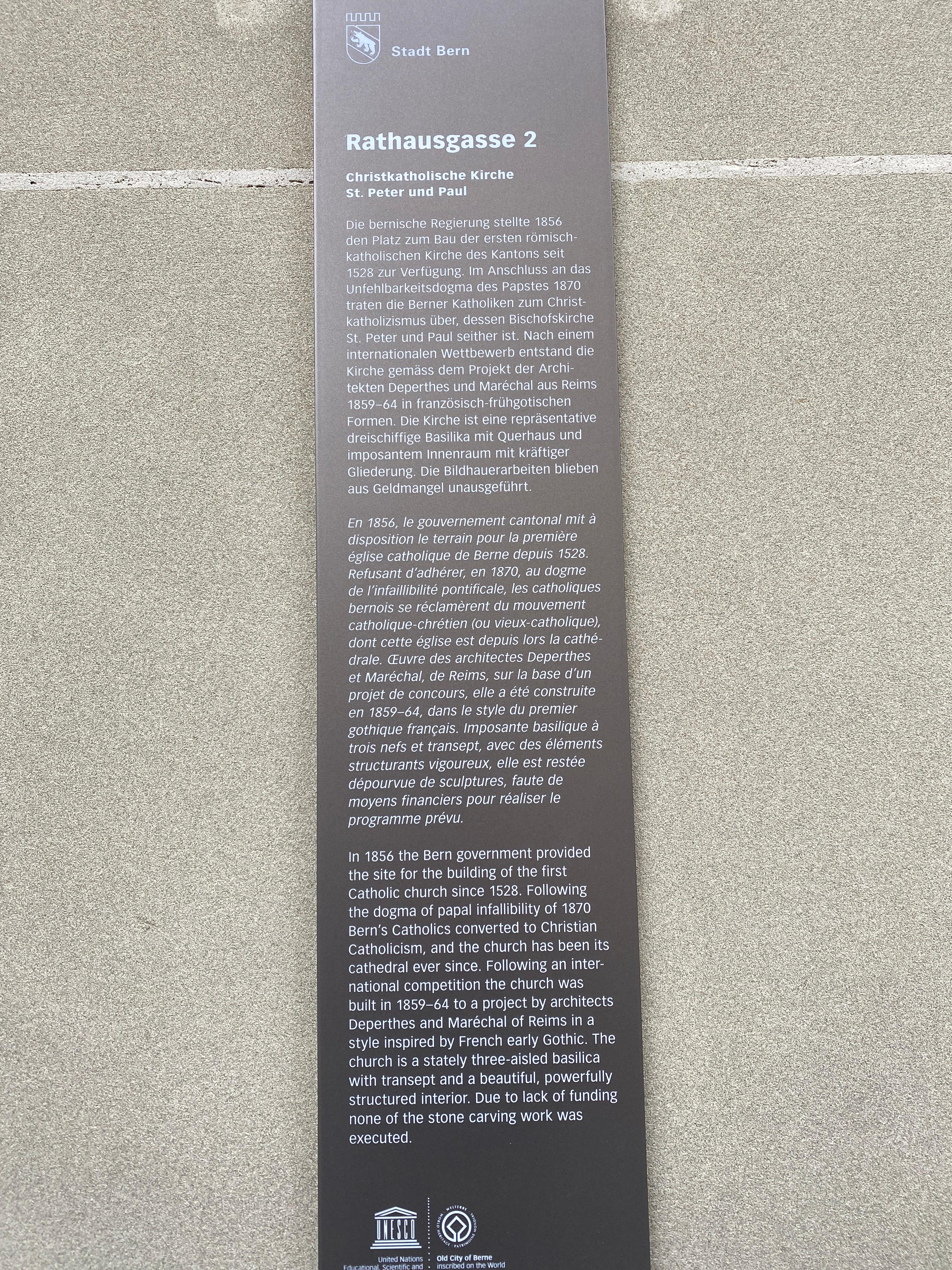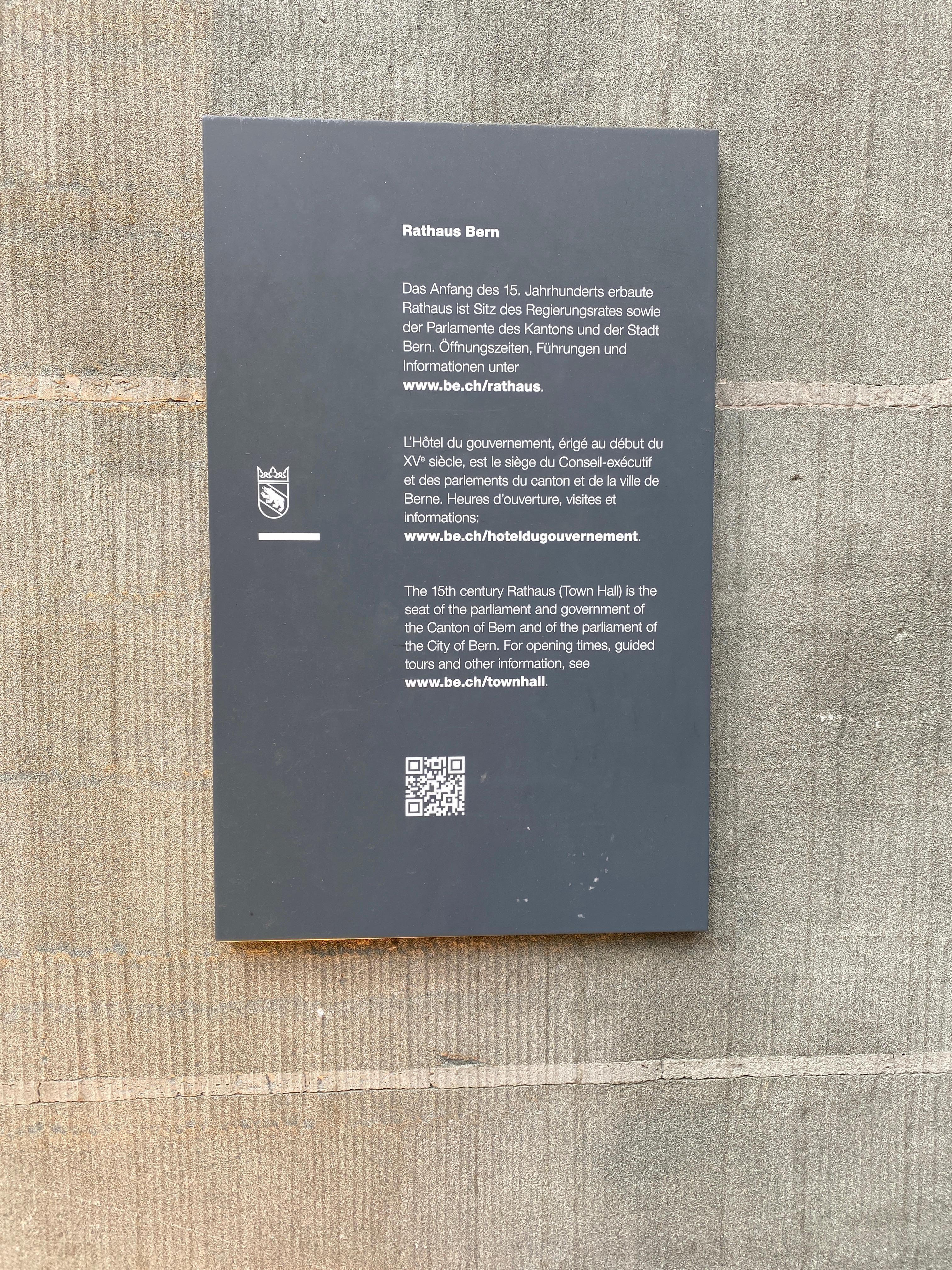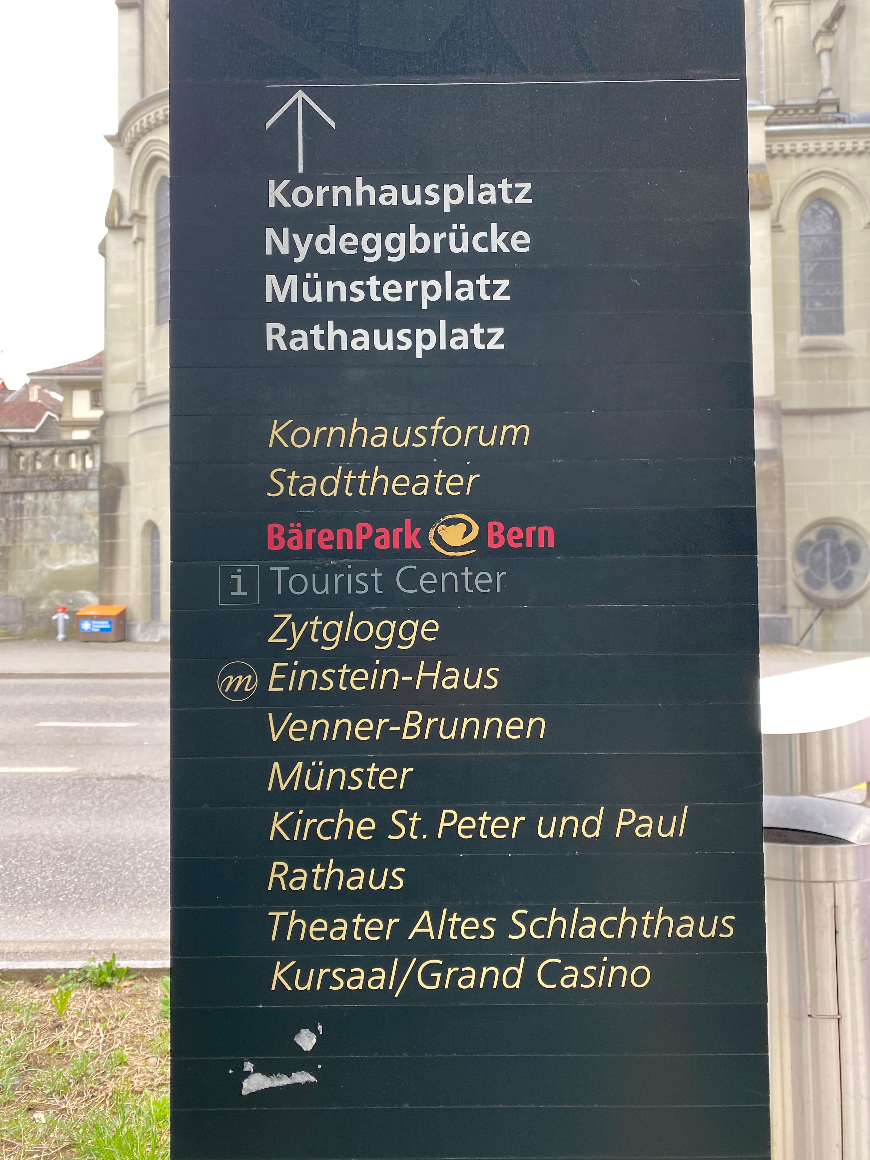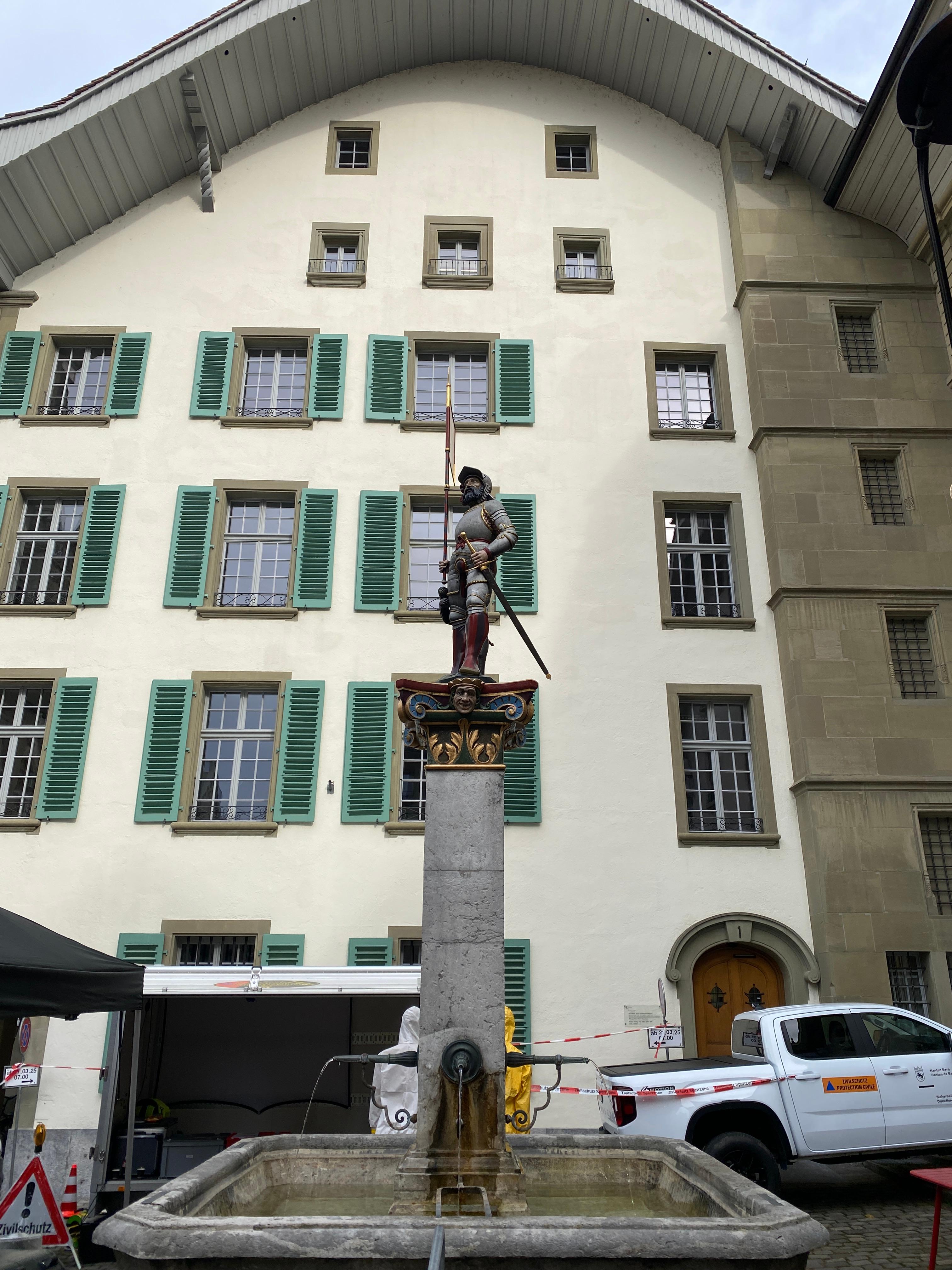 주차장을 나서서 길을 건넜는데 솔직히 여기가 어딘가 싶을 정도로 휑했는데 구시가지의 구조상 시가지 안으로 들어가야 뭐가 있어서 시가지 밖의 길에서는 아무 것도 보이지 않아서 그런거다. 표지판에 의하면 어디로 걸어갈 수 있는지 잘 나와있다. 치트글로게 (Zytglogge)라고 불리는 시계탑 (감옥으로도 쓰였다고 한다)가 명소 중 하나라서 의심하지 않고 가라는 방향으로 걸어갔다. 골목길로 들어서니 정말로 바로 보이는 여러 건물들이 있었다. "시청"이라는 이름이 붙은 지역에 걸맞게 시청이 제일 먼저 보였다. 크지는 않았지만 좀 특이하게 지어진 건물이어서 눈에 확 들어왔다. 시청 옆에는 Kirche St. Peter und Paul라는 이름의 멋진 교회 건물도 있었다. 그리고 시청 앞에는 작은 분수와 작은 동상이 있었다. 분수는 Vennerbrunnen이라는 이름이 있다고 한다.