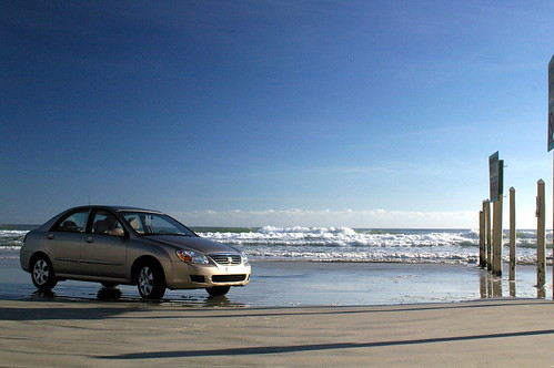 데이토나 비치에서 또 하나의 명물인 자동차로 샌드비치 위에서 달리는 기분을 만끽해보다가 광고 사진 한장 찍어봤다. 이때 아쉬었던 점은 예전에 플로리다에 왔었을 때는 컨버터블 렌트를 해서 사진이 더 나았을텐데 이번에는 해변가에 별로 어울리지 않는 차였다는거. 그래도 잘 보면 자동차가 비치위에서 바닷물을 들락날락 하는 곳까지 운전이 가능했음을 충분히 알만한 앵글로 잡혔다.