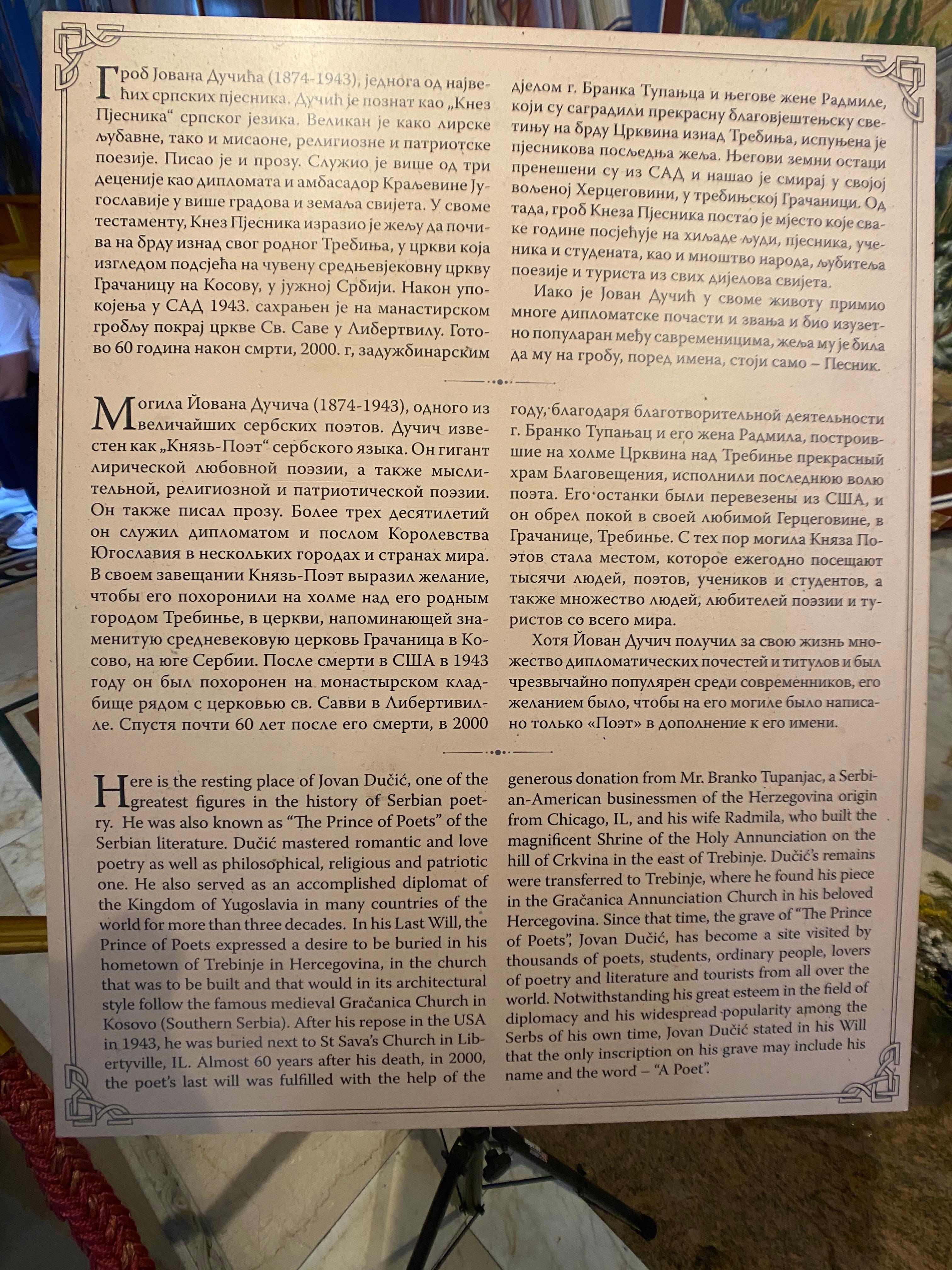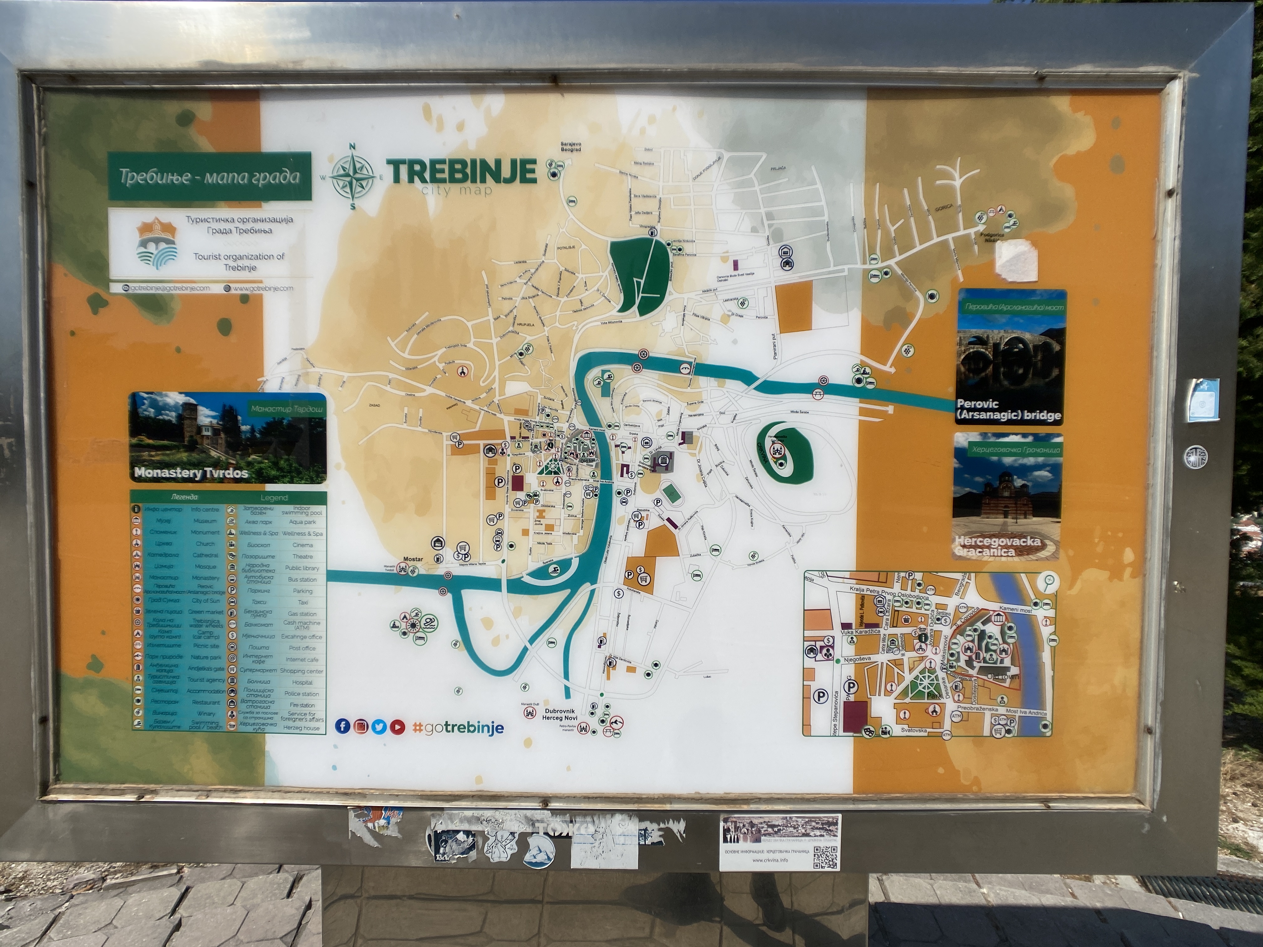 트레비녜라는 동네가 큰 도시도 아니고 여행객들을 사로 잡는 아주 유명한 곳은 없지만 볼게 정말 좀 있다. 제일 먼저 Hercegovačka Gračanica Temple라는 사원/교회로 갔다. 산 위에 있는 곳인데 찻길이 거의 1차선이 겨우 있는 수준이었는데 사람이 아주 많지 않기 때문에 상대편에서 오는 차가 없어서 쉽게 올라갔다. 주차장도 크지 않았지만 평일의 오전 시간이라 주차도 수월했다. 맑은 날씨에 햇볕이 벌써 뜨거울 때라 경치 감상에 아주 좋았다. 트레비네의 유명 관광지를 소개하는 지도를 보니 계획대로 움직이면 될 듯 했다. 여기 말고 다른 행선지가 두 군데 더 있다.