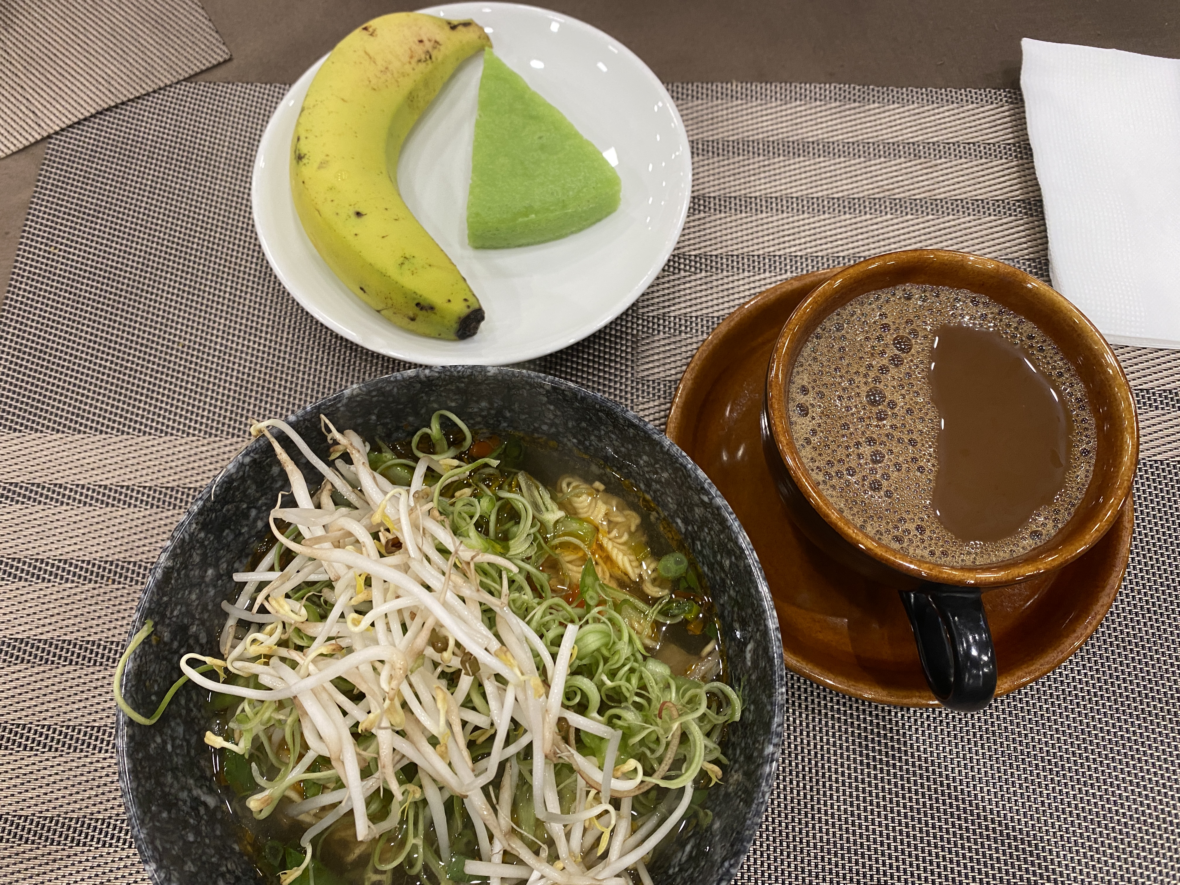 아침으로 또 국수와, 커피, 바나나, 그리고 술빵 맛이 나는 초록생 빵 한조각이다.