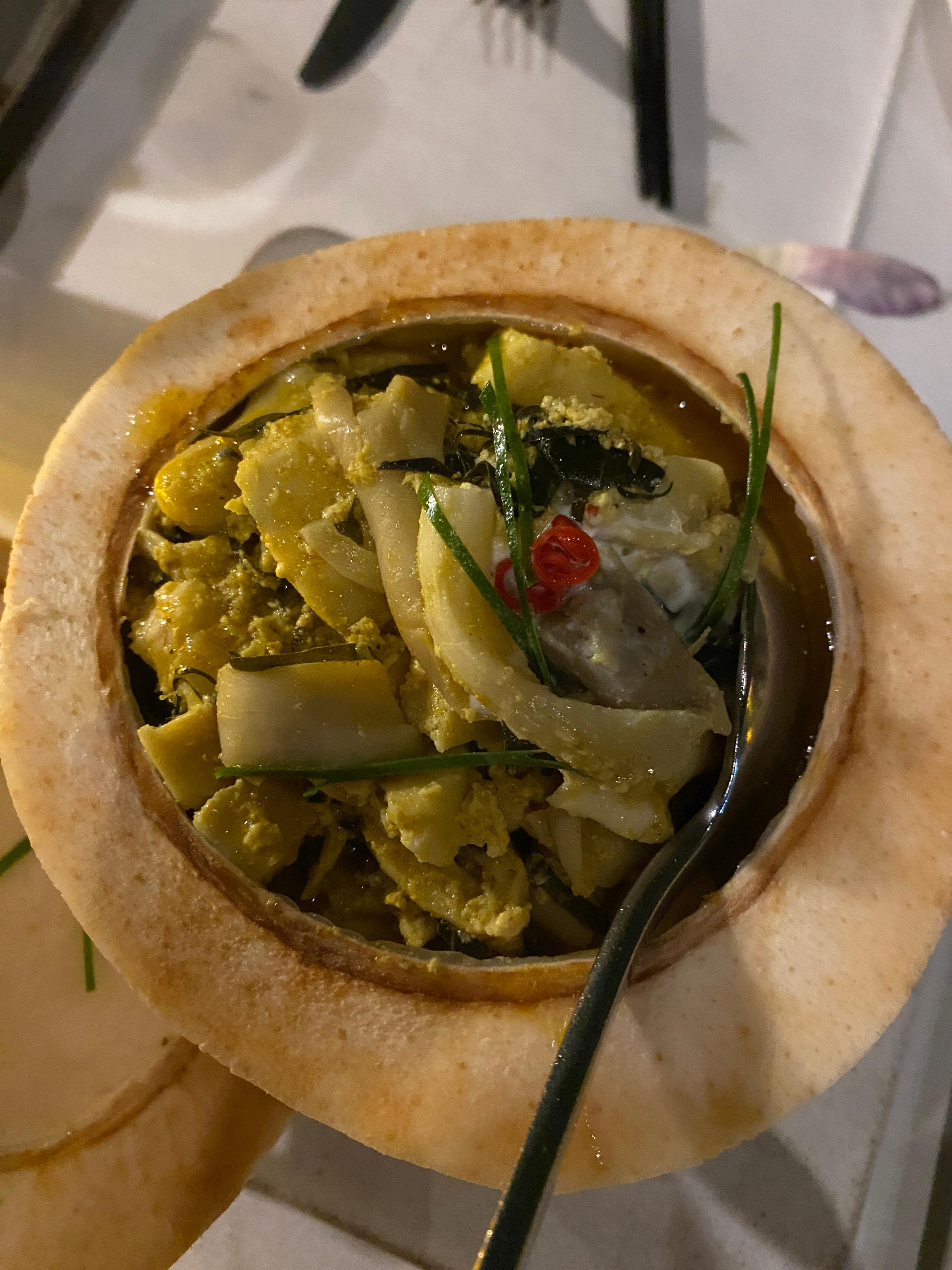 앙코르 유적 탐방 둘째날도 점심은 유적과 가까운 식당을 가게 되었다. 이날은 비가 무척 와서 비를 피하기 위해서 비가 한창일 때 식당을 찾았다. Rom Chang Angkor란 곳이다. 이미 음식을 대충 파악해서 여기서는 네 명의 일행이 3인분 정도 되게 간단한 음식만 시켰는데 오히려 그게 정말로 좋았다. 맛도 적당히 있어서 나쁘지 않았다. 열대 지역이라 코코넛도 음료수의 일환으로 시킬 수가 있다.