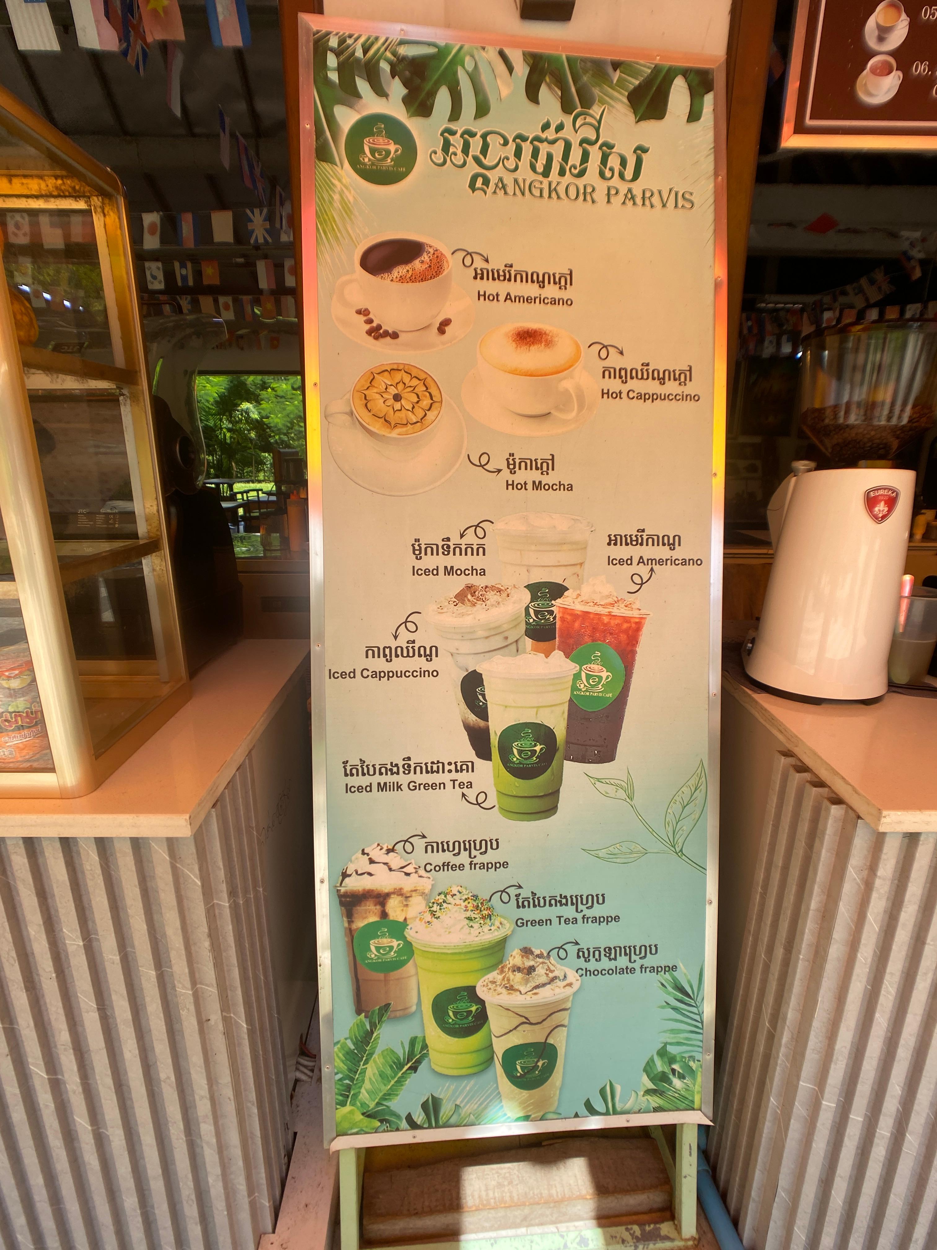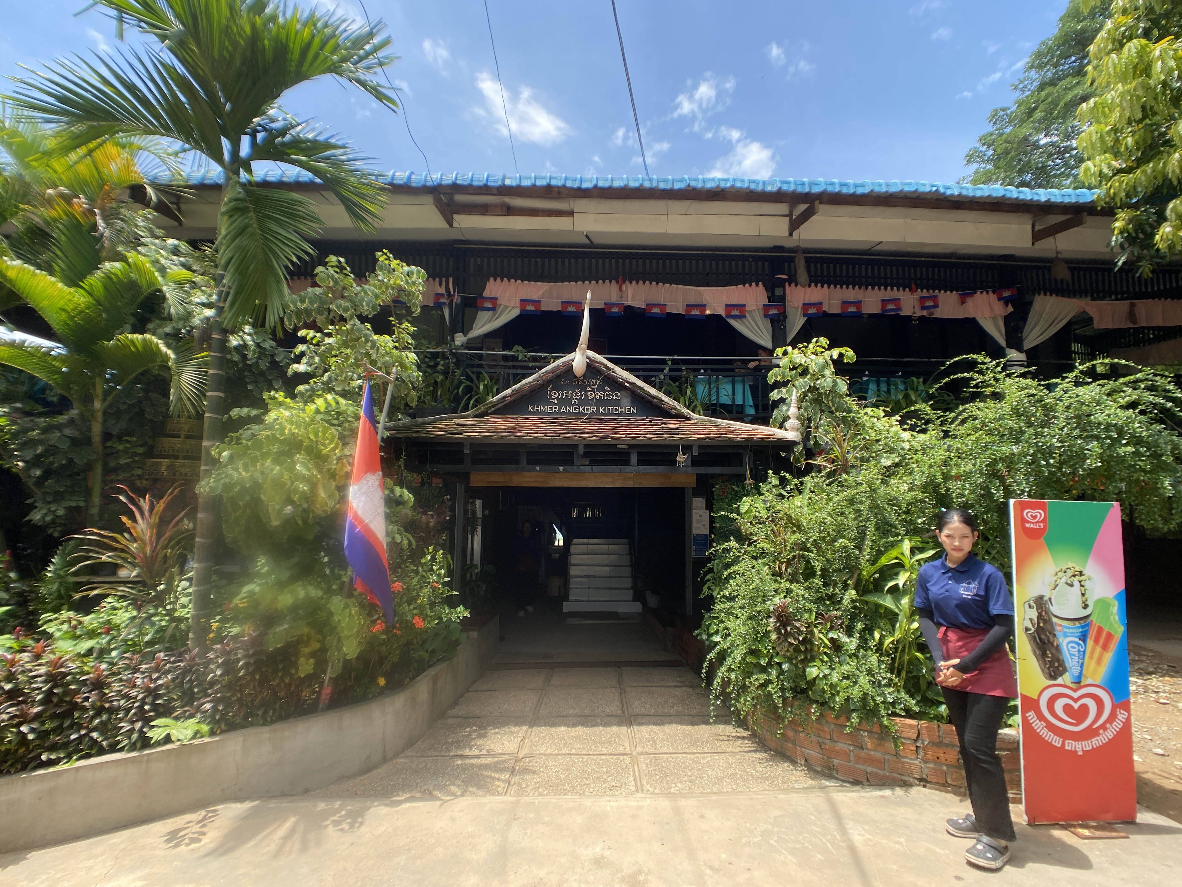 앙코르 유적 탐방을 이틀에 걸쳐 했기 때문에 점심을 유적지 근처에 있는 완전 관광객 상대의 식당에서 먹었다. 유적 탐방 첫날의 점심은 우선 그 전에 더워서 차가운 음료수를 앙코르와트 바로 옆의 카페에서 마시고 식당을 갔다. 크메르 앙코르 키친 (Khmer Angkor Kitchen)이란 이름을 가지고 있다. 음식 사진을 찍을 새도 없었던 이유가 너무 배고파서 빨리 먹어서가 아니고 별로 인상적이지 않았기 때문이다. 결코 "나빠서"가 아니니 오해는 없길 바란다.