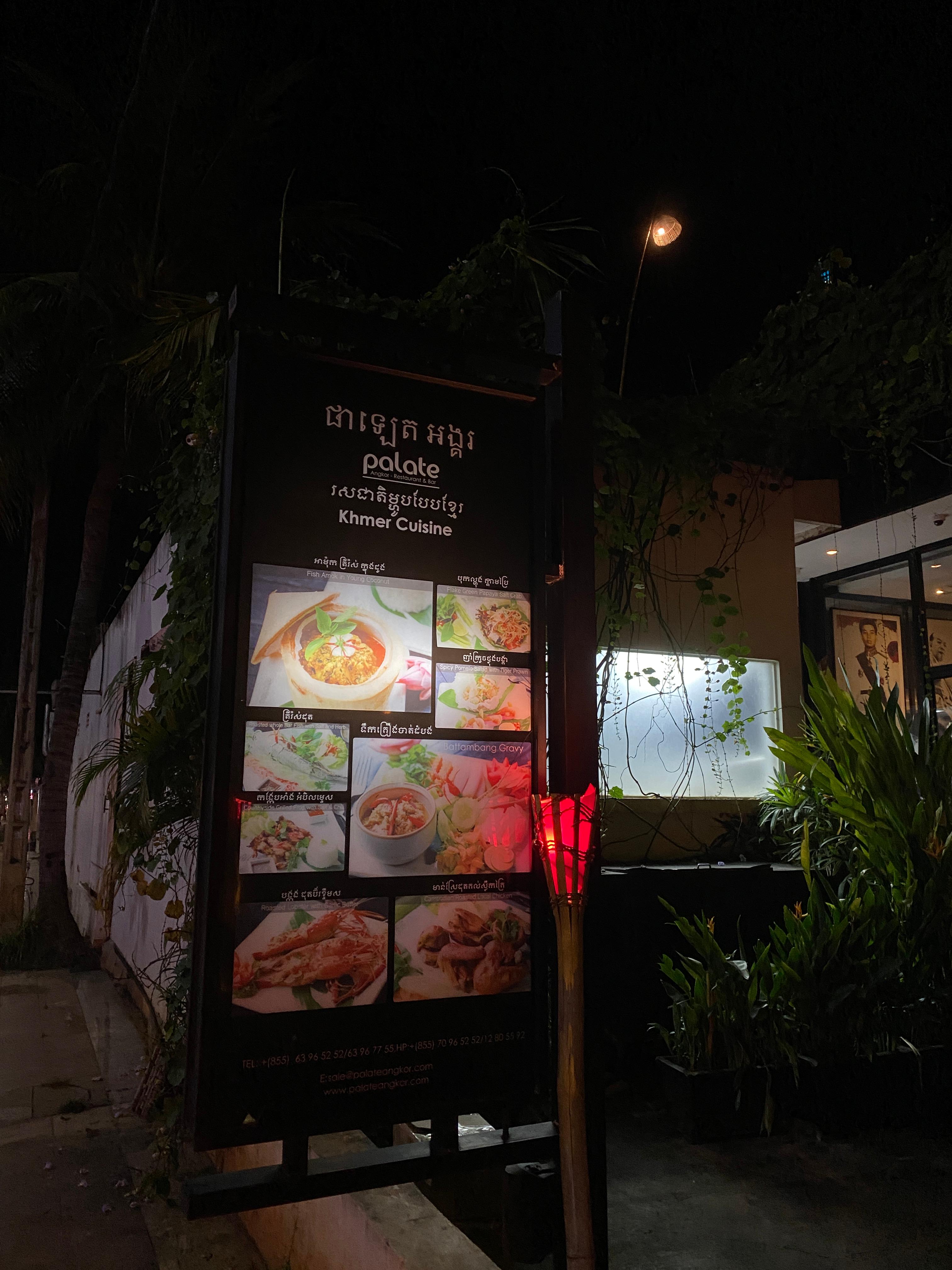 힘든 일정을 마치고 수영도 좀 하고 쉬고 난 뒤 저녁을 또 호텔 근처에 걸어갈 만한 곳으로 AI에게 추천 받아서 갔다. Palate란 곳이다. 여기도 캄보디아 현지음식 (Khmer Cuisine)이라고 홍보를 하고 있지만 실상은 현지음식을 "현지화" 한 것도 많고 아예 현지음식을 잘 못 먹는 여행객들을 위해서 적당히 먹을만 한 것들도 많이 구비해 둔 곳이다. 충분히 추천받을만한 곳이다.