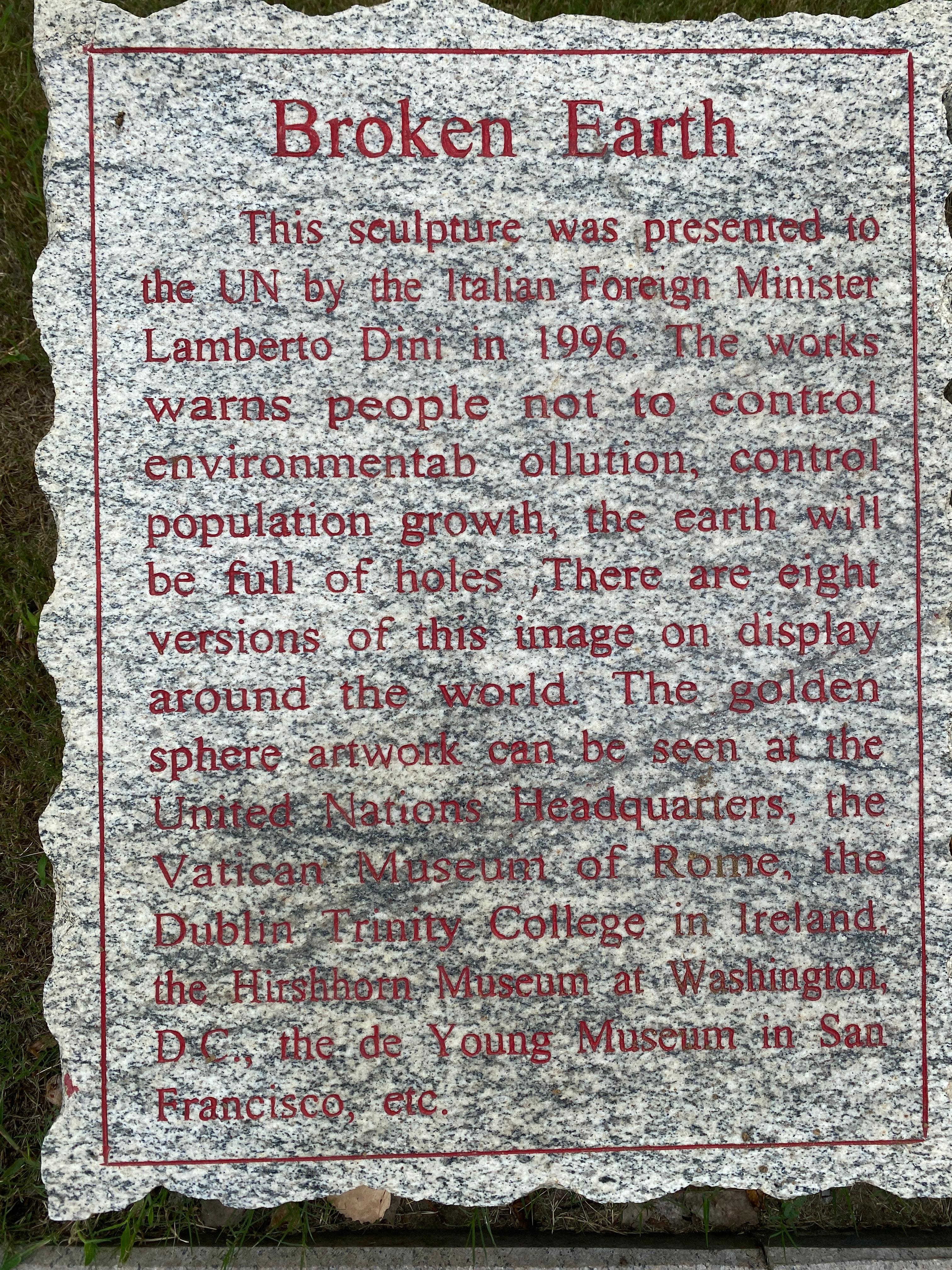 정말 이 때 쯤 되어서는 어디서 본 듯한 그래도 어디서 봤는지 또렷히 기억하는 그런 조각 작품들이 많다는게 실감이 되었다. 이 부서진 지구 (Broken Earth)라는 작품은 설명에도 나와 있지만 여러 곳에 있는 작품인데, 아일랜드 더블린의 트리니티 칼리지 (Trinity College Dublin)에서 본 작품이 바로 생각이 났다.