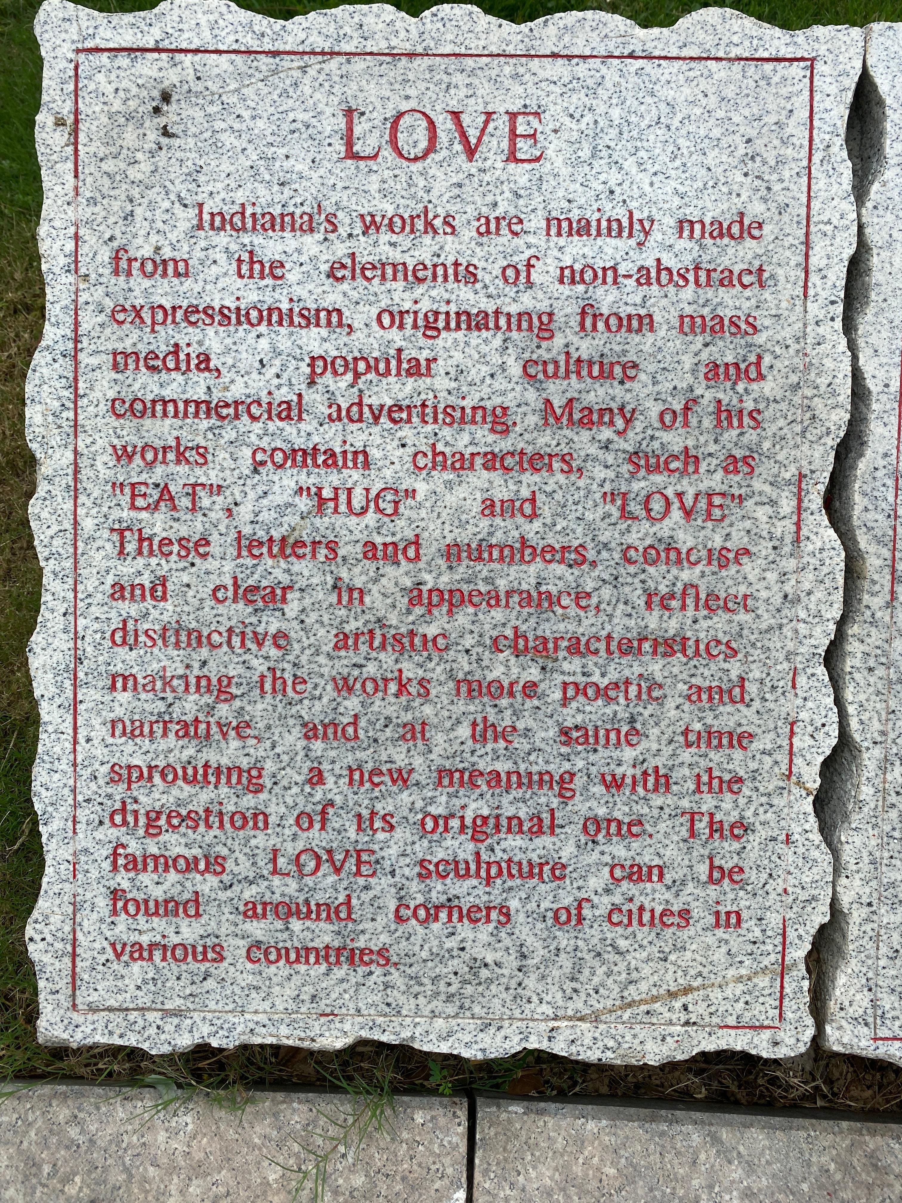 이 큰 LOVE 조형물은 난 인디애나폴리스 (Indianapolis) 미술관에 있는걸 제일 먼저 봤다. 거기가 오리지널이라고 한다. 로버트 인디애나 (Robert Indiana)의 작품이다.