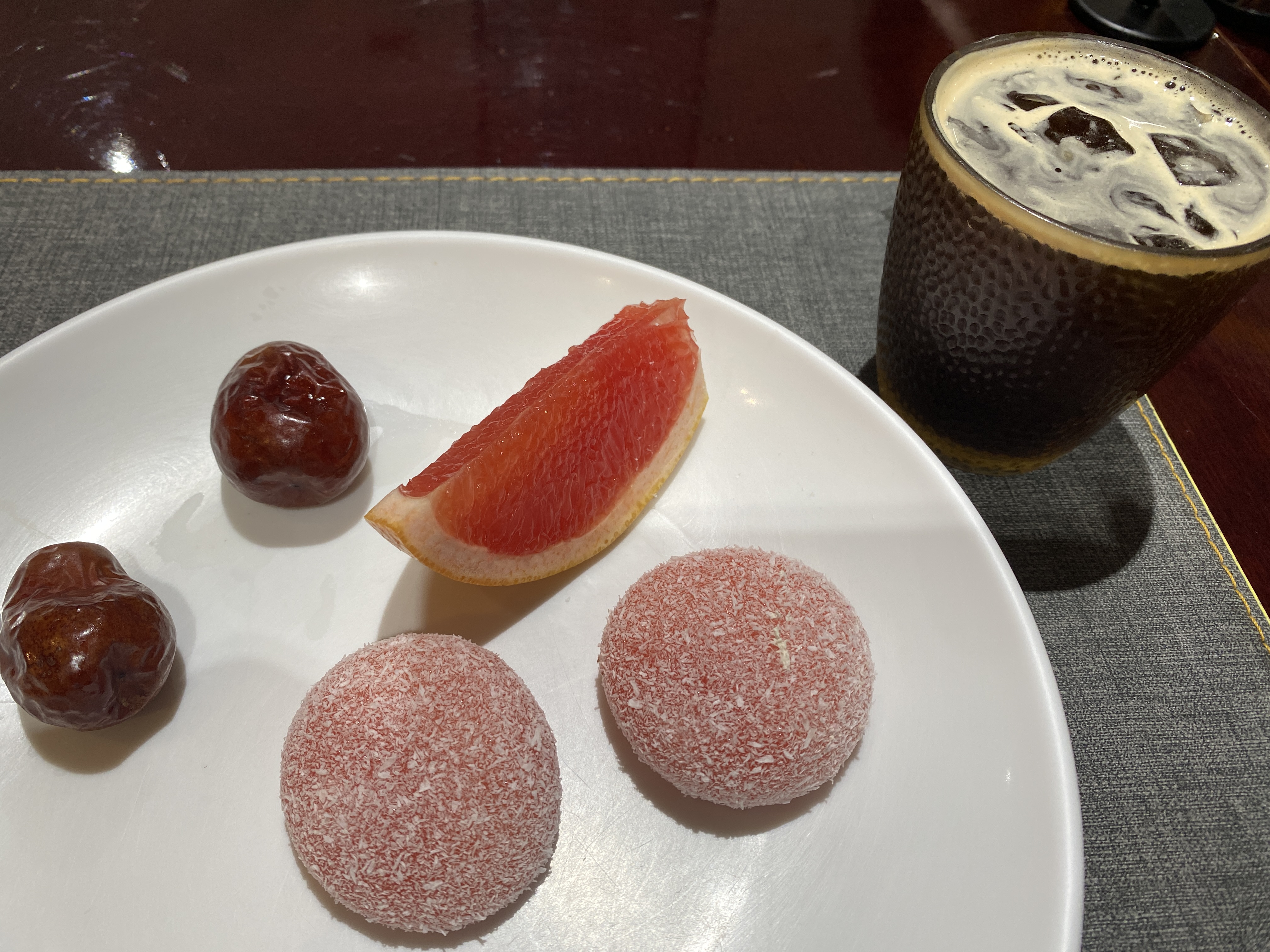 마지막날 호텔을 떠나기 전의 아침은 더 단촐하다. 그 전날 먹은 저녁이 아무래도 부담이어서 아이스아메리카노 (베스트 메뉴이다)와 과일, 모찌 이런 식으로 정말 간단히 먹었다.